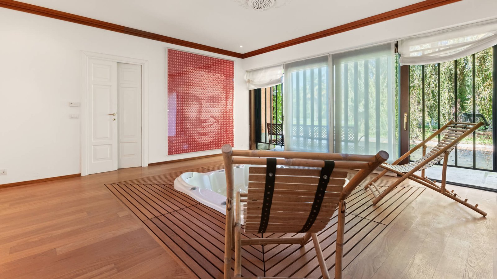 Un’area dedicata ospita una grande vasca idromassaggio con vista sul magnifico giardino, creando un angolo di assoluto relax. Al primo piano si trovano quattro camere da letto, ognuna con il proprio bagno privato, e una zona relax, ideale per momenti di tranquillità .