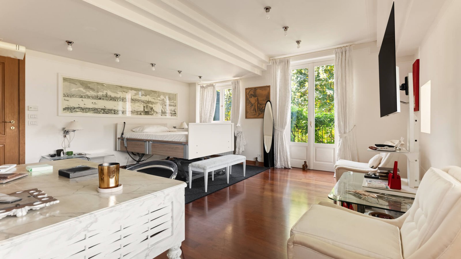 La seconda unità , dal carattere moderno e ristrutturata nel 2012, si distingue per la sua eleganza e luminosità . Al piano terra, l’immobile si apre su tre maestosi saloni caratterizzati da ampie vetrate su entrambi i lati, che donano una luminosità naturale straordinaria, creando ambienti caldi e accoglienti.