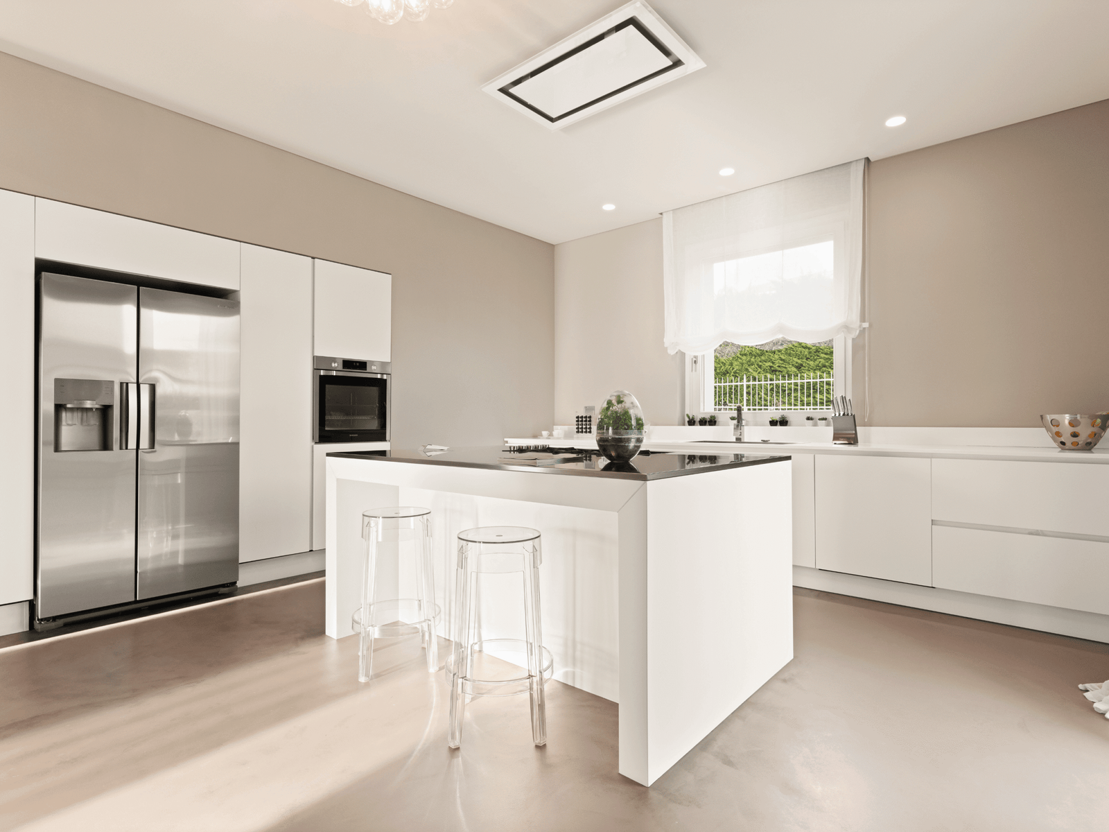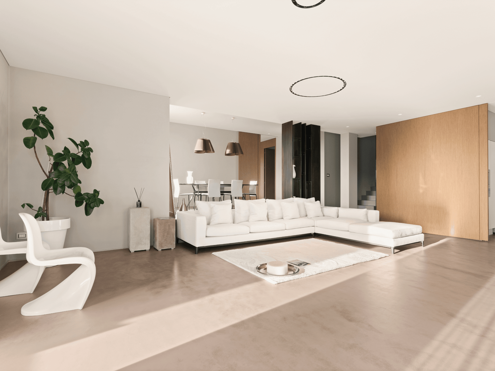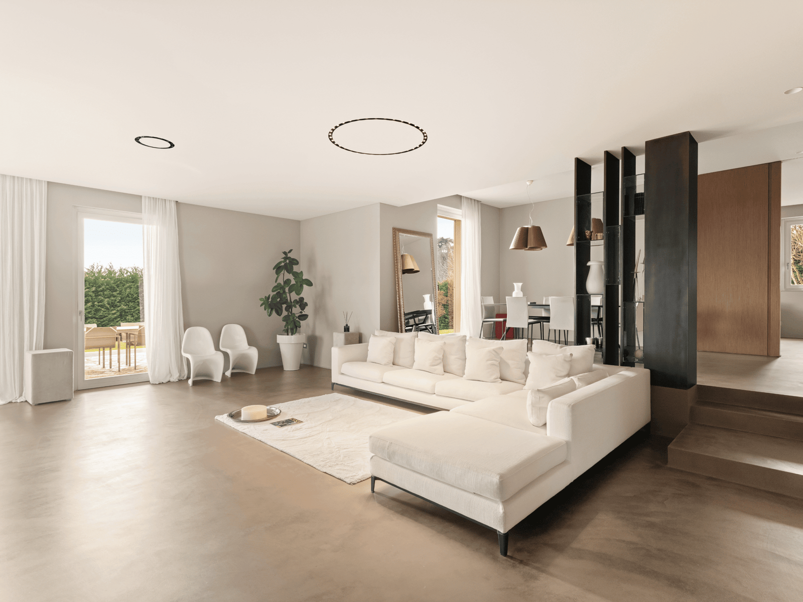 La zona giorno, cuore pulsante della villa, si sviluppa su una doppia altezza, dove pieni e vuoti si alternano sapientemente creando un senso di apertura e continuità tra interno ed esterno.