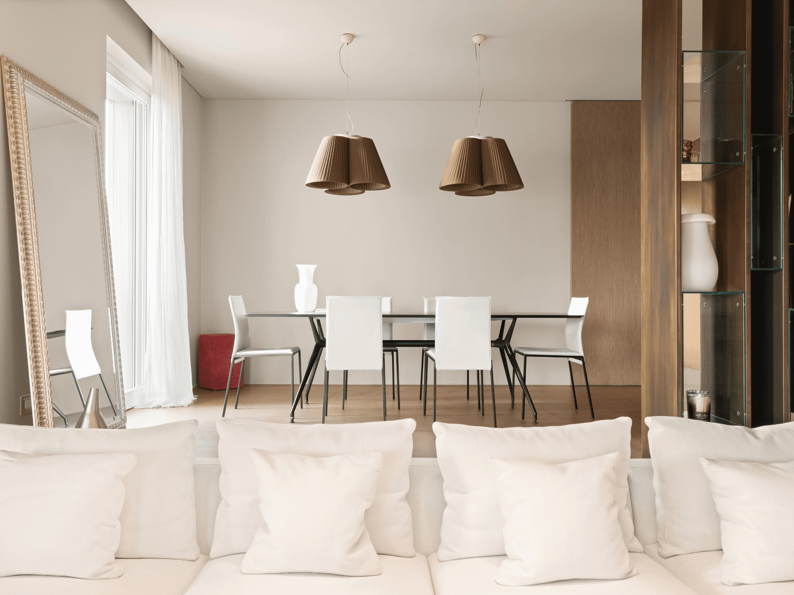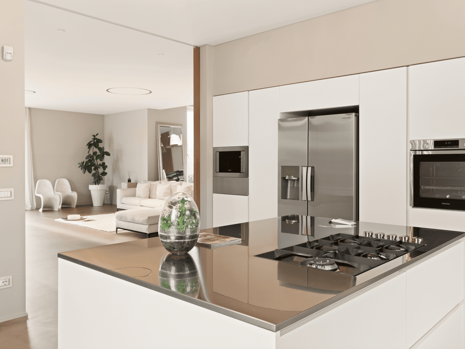 La sala da pranzo, posizionata su un livello rialzato, regala una prospettiva unica, dominando la scena con eleganza. La cucina, moderna e funzionale, è perfettamente integrata nella zona giorno, offrendo uno spazio conviviale e raffinato.