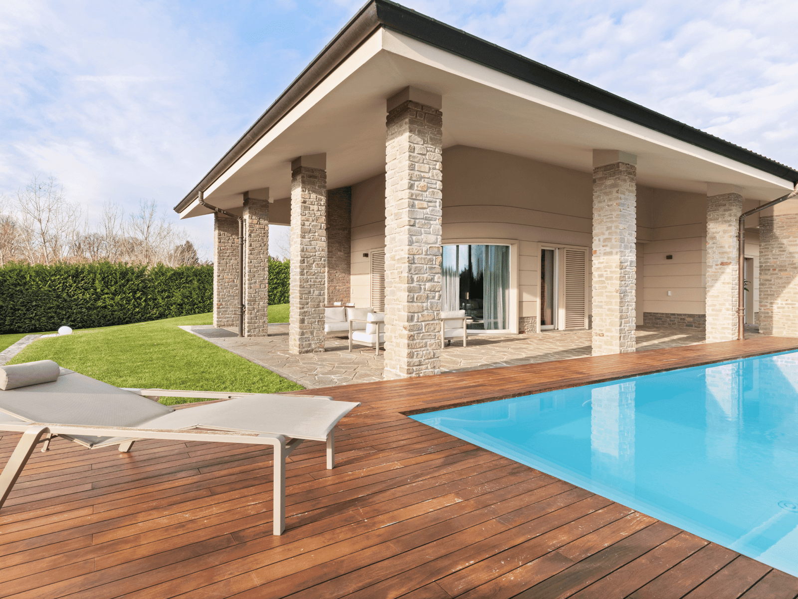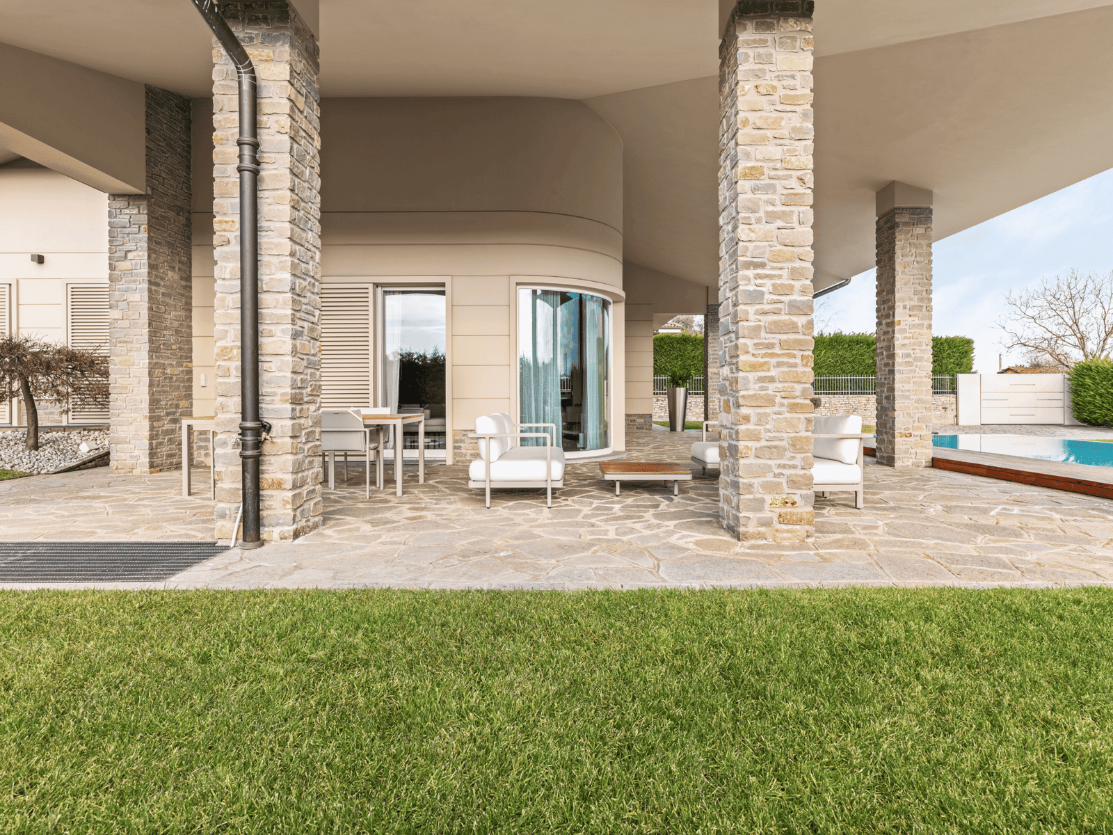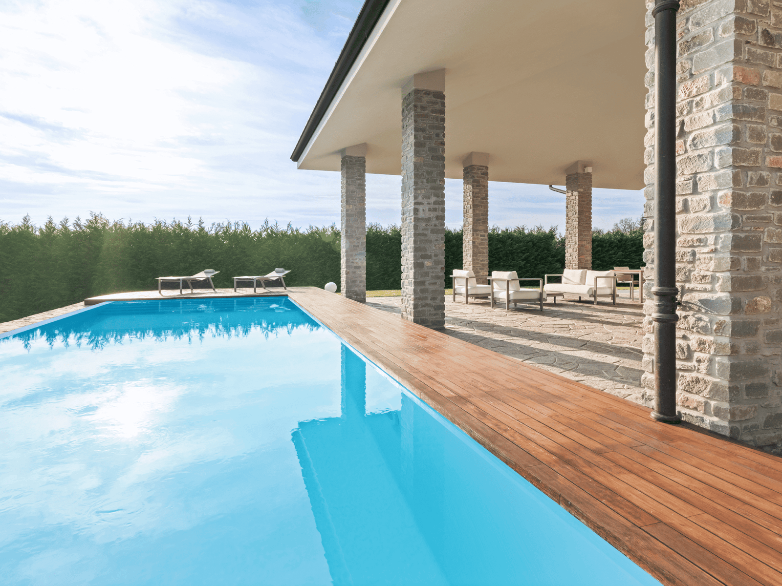 La scenografica piscina diventa un elemento in grado di arricchire e valorizzare il quotidiano offrendo spazi accoglienti per rilassarsi in totale privacy, regalando scenari suggestivi in ogni momento della giornata.