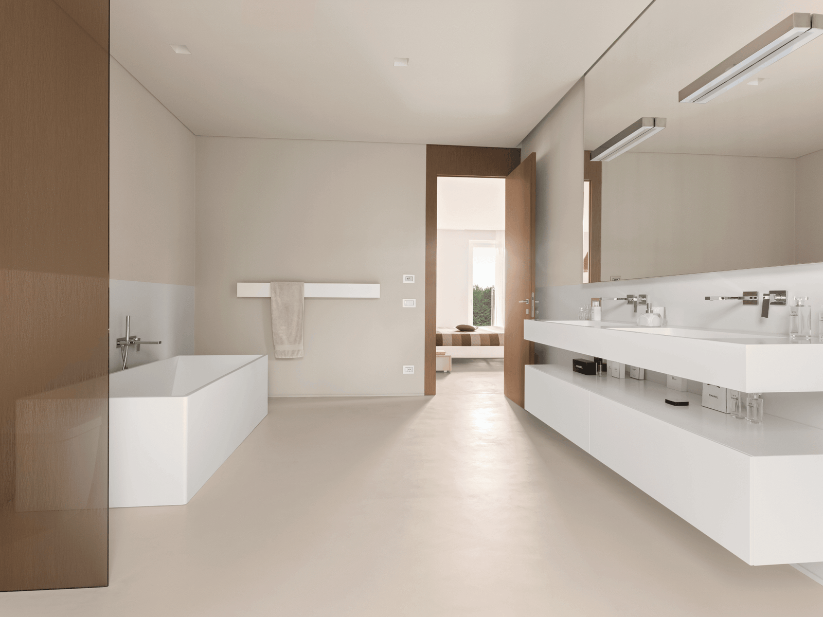 Gli interni della villa sono progettati per offrire un’esperienza esclusiva: il grande salone del piano terra, caratterizzato da linee pulite e da una luminosità straordinaria, si apre sul patio e la piscina grazie alle ampie vetrate, creando un continuum tra gli spazi interni ed esterni.