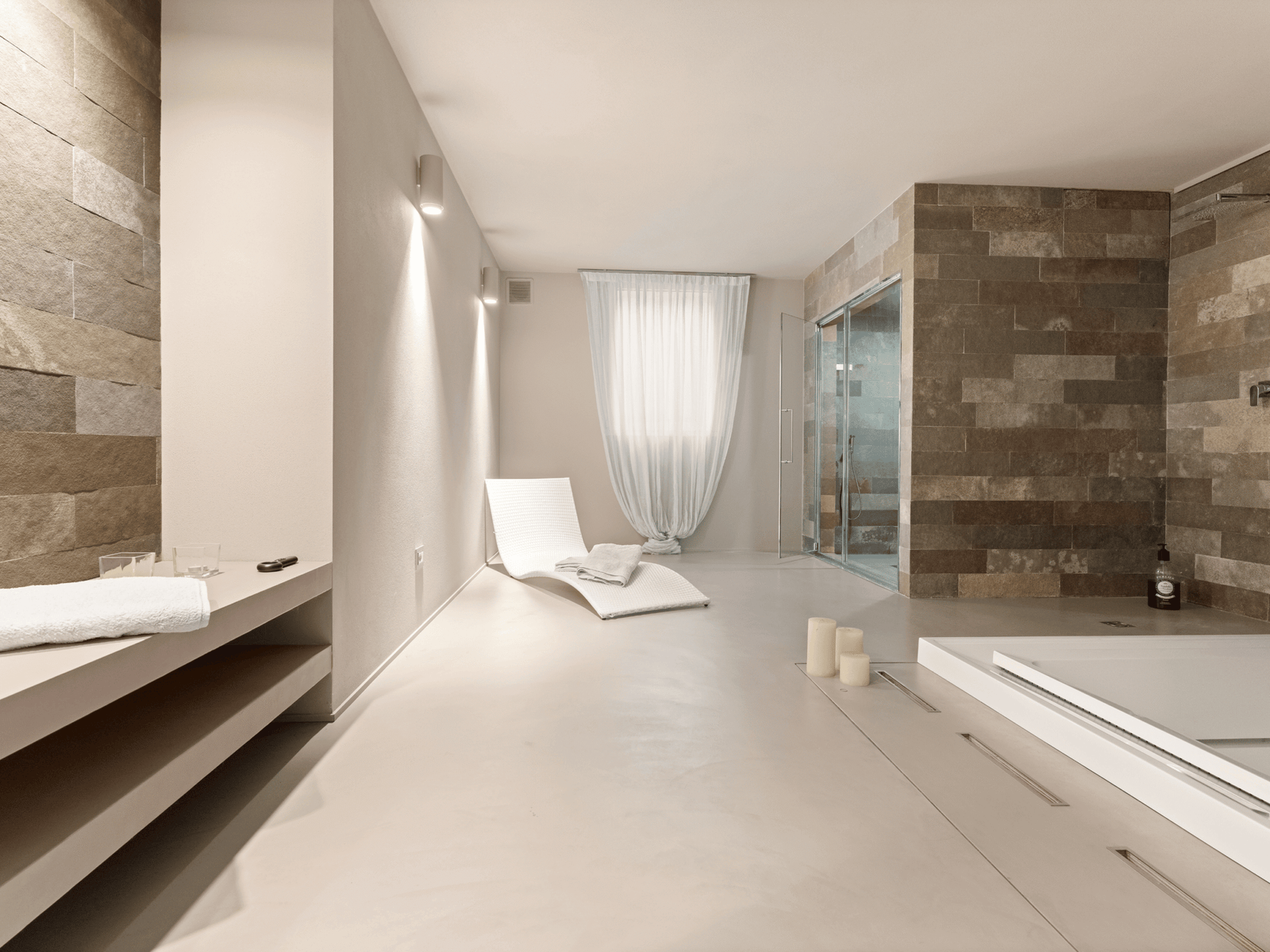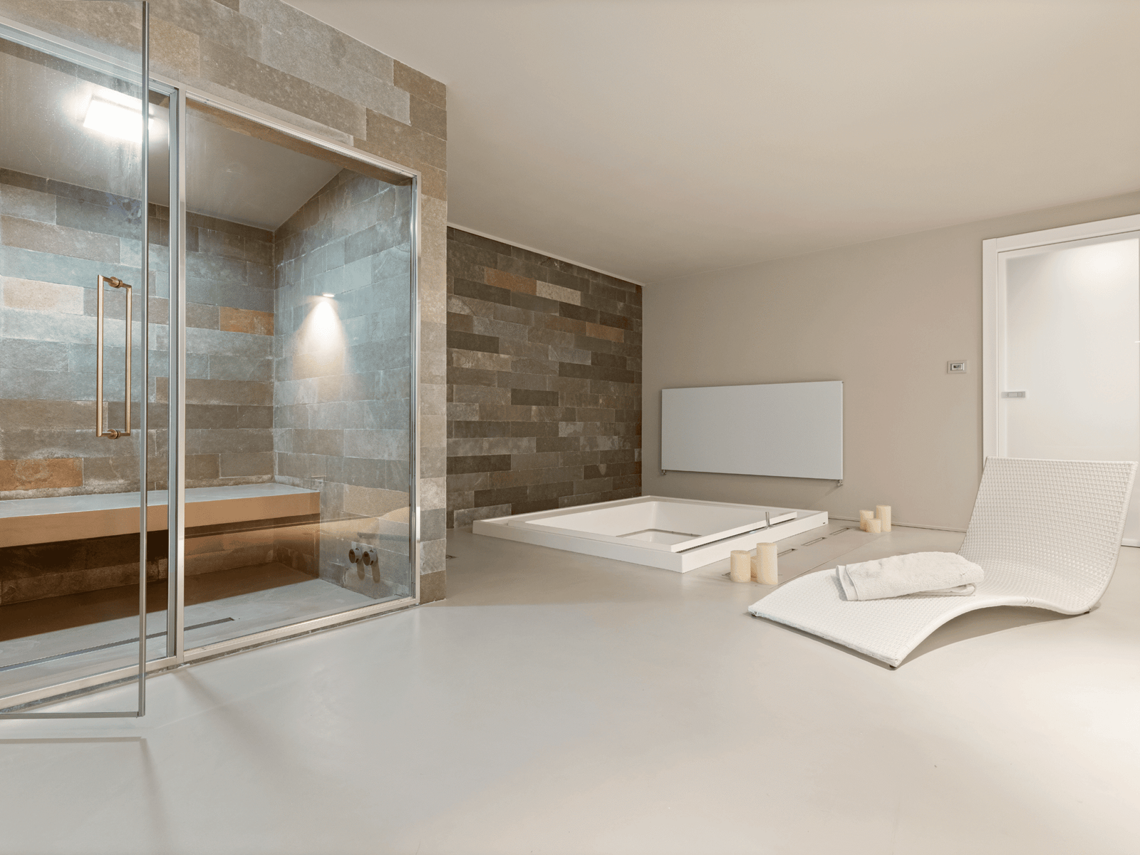 Il piano inferiore della villa è un autentico scrigno di comfort e relax. Qui si trova una raffinata area spa, dotata di vasca idromassaggio per quattro persone, doccia e bagno turco, uno spazio ideale per rigenerarsi dopo una giornata intensa.