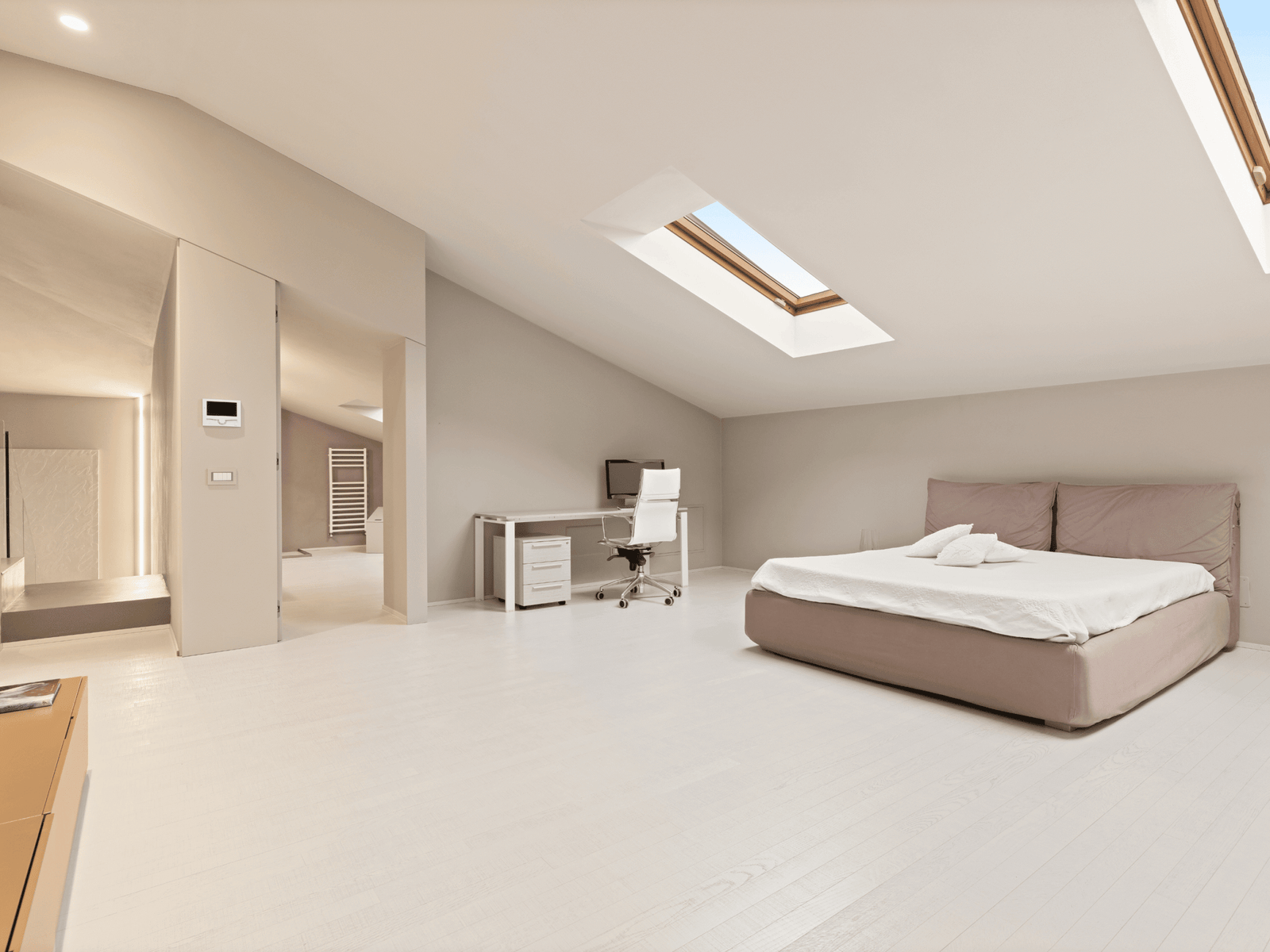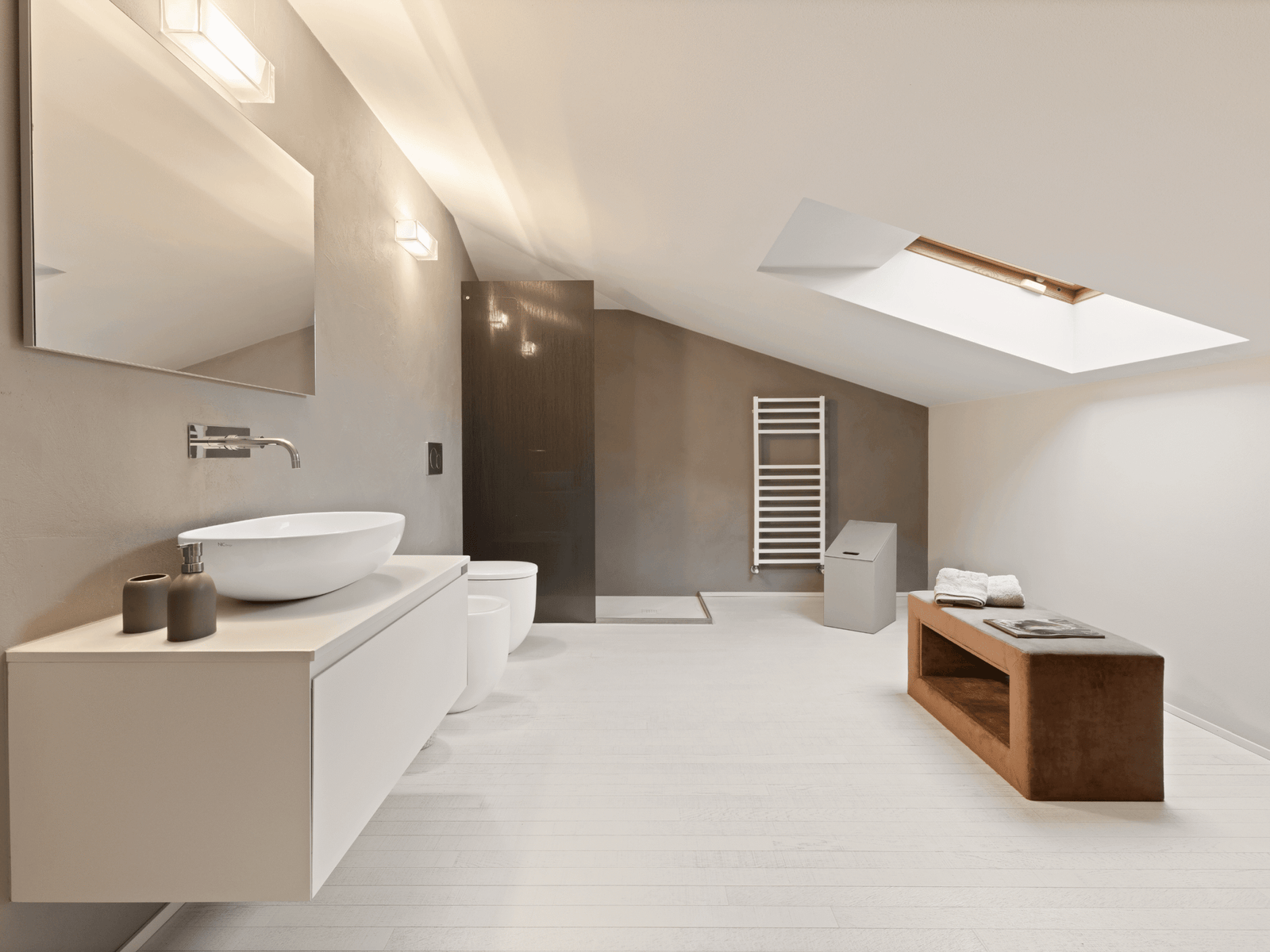 Una scala in cristallo conduce al piano superiore, mansardato, dove si trova un salottino, una camera e un’ampia camera con cabina armadio e bagno en suite.
