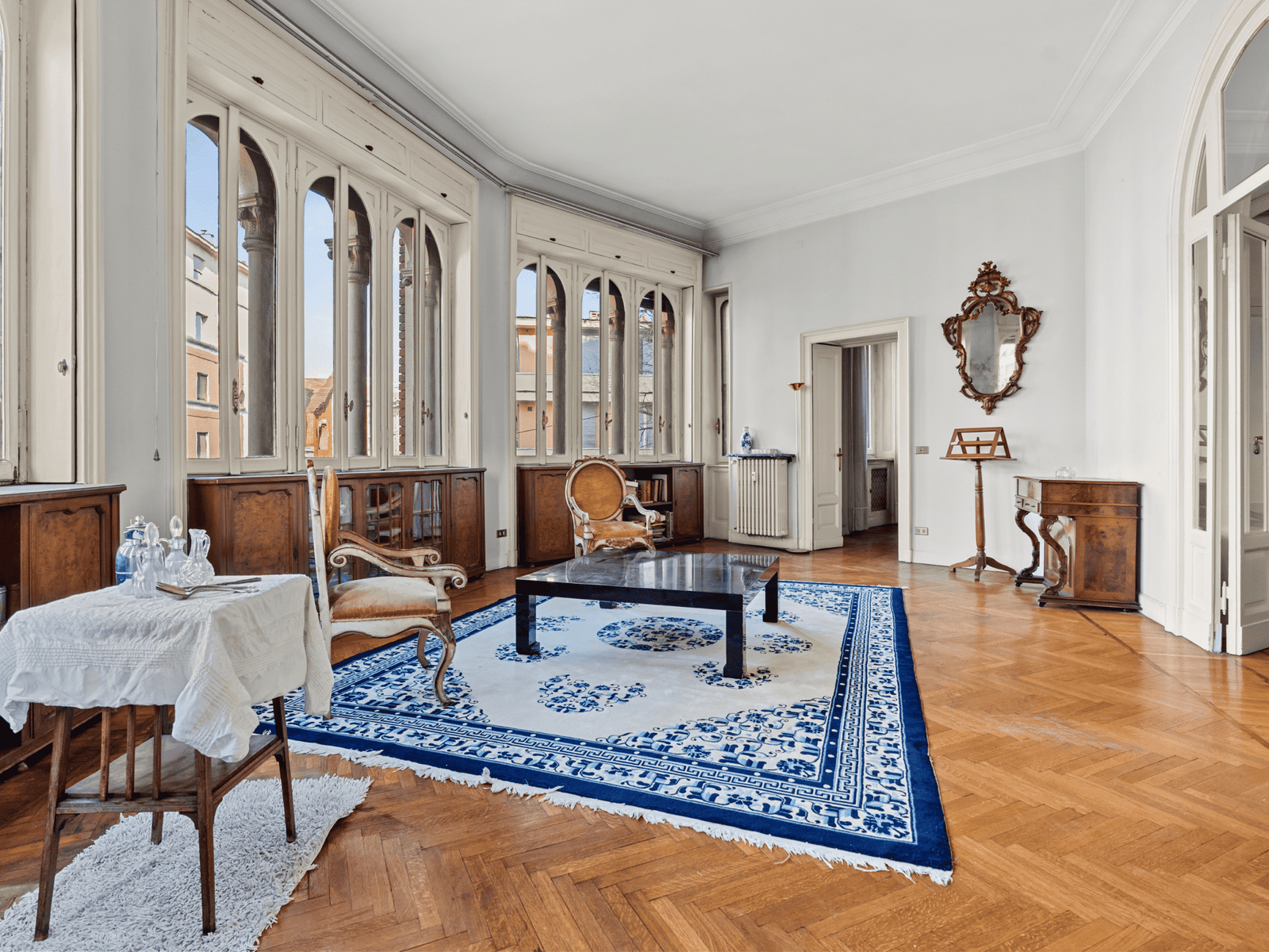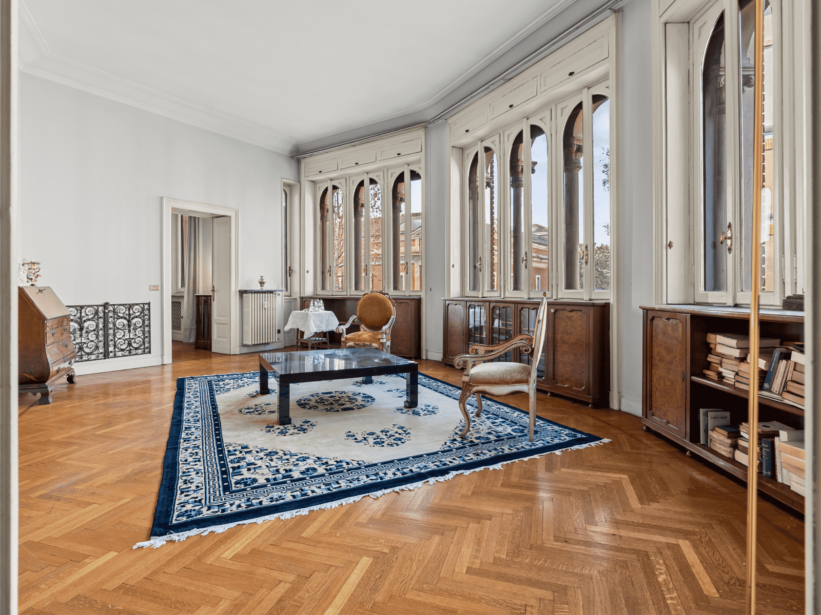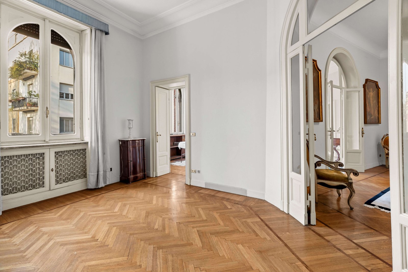 Posto al piano secondo, con un ingresso di rappresentanza che accoglie un ampio soggiorno caratterizzato da questa forma a semicerchio, molto scenografica, le numerose finestre caratterizzate dalla forma e dalla struttura e dallo stile del palazzo, regalano una vista ampia e luminosa. La luce naturale che proviene dall’esterno regala una piacevole sensazione di unicità . Attualmente l’immobile presenta una zona ampia dedicata alla cucina con annessa zona di servizio molto comoda e ampio balcone, quattro camere, sala da pranzo e studio.
