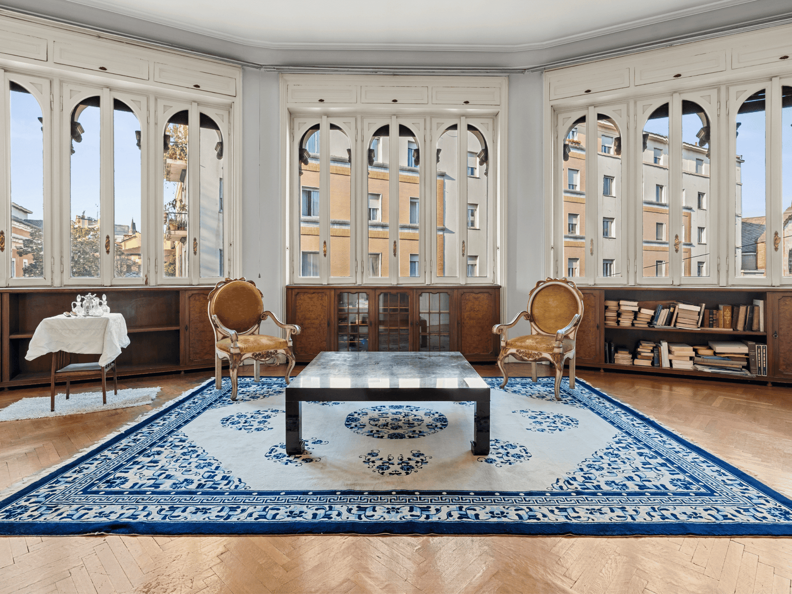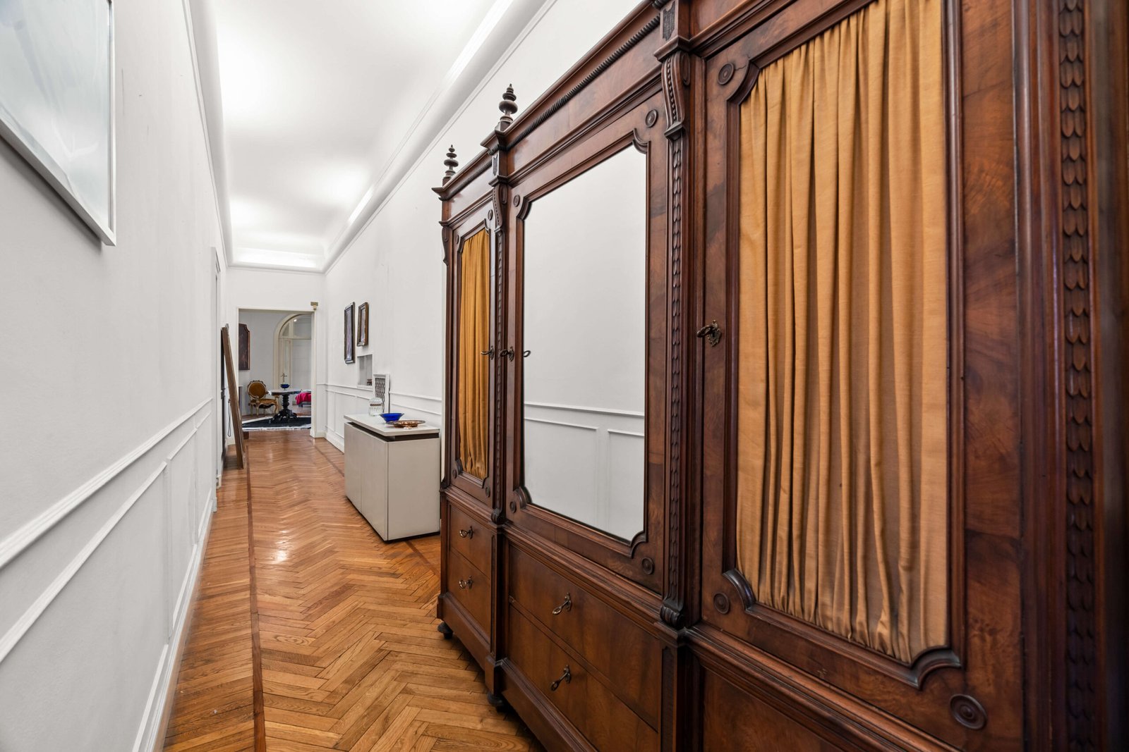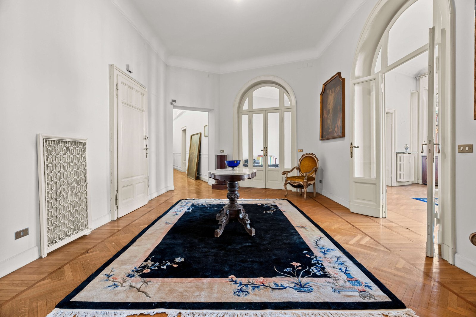 Posto al piano secondo, con un ingresso di rappresentanza che accoglie un ampio soggiorno caratterizzato da questa forma a semicerchio, molto scenografica, le numerose finestre caratterizzate dalla forma e dalla struttura e dallo stile del palazzo, regalano una vista ampia e luminosa. La luce naturale che proviene dall’esterno regala una piacevole sensazione di unicità . Attualmente l’immobile presenta una zona ampia dedicata alla cucina con annessa zona di servizio molto comoda e ampio balcone, quattro camere, sala da pranzo e studio.