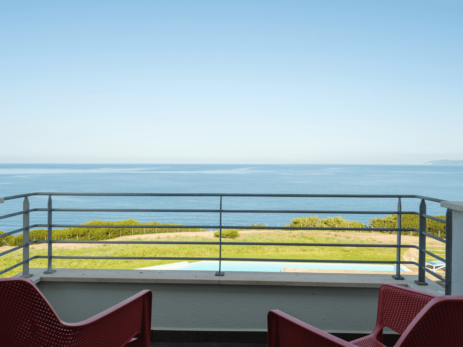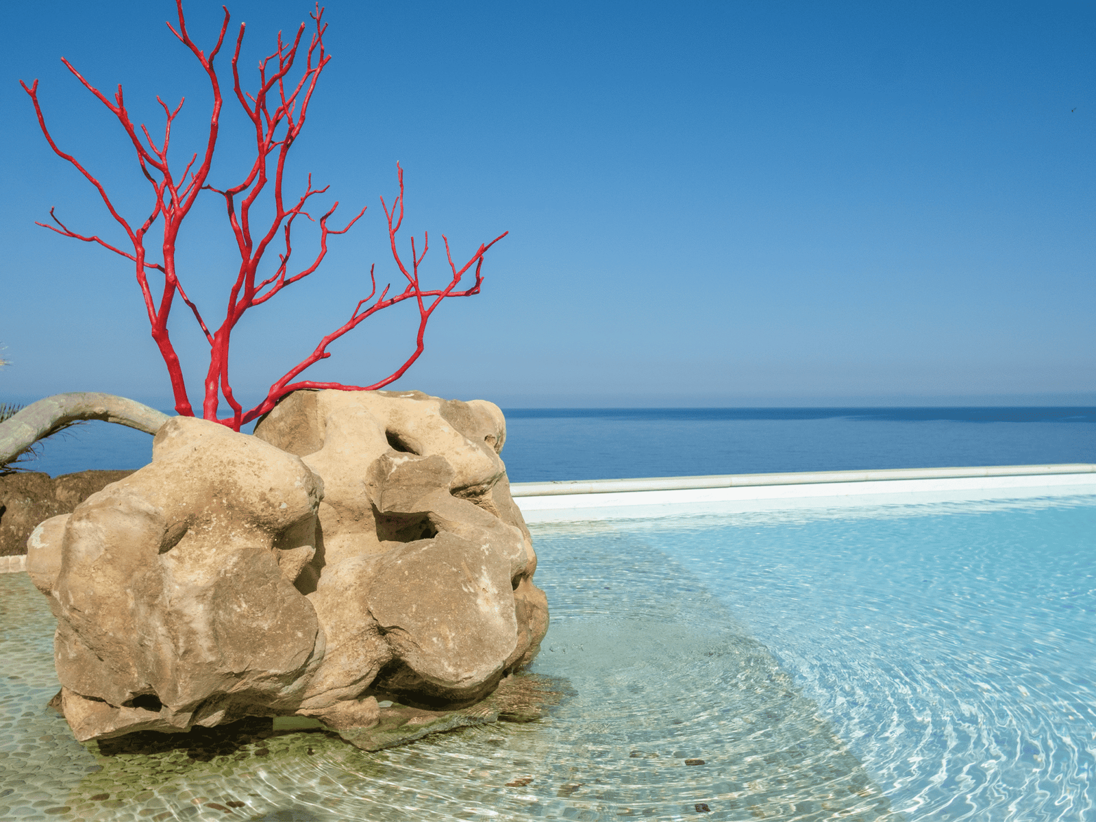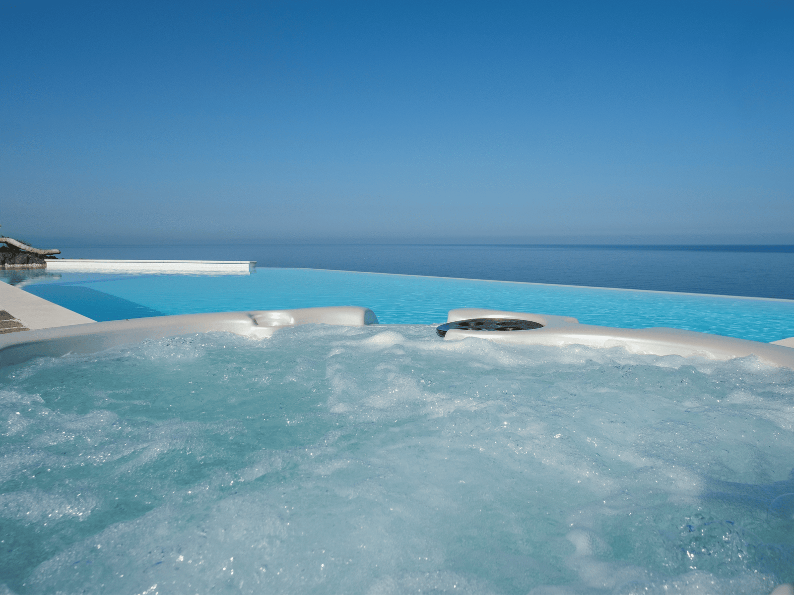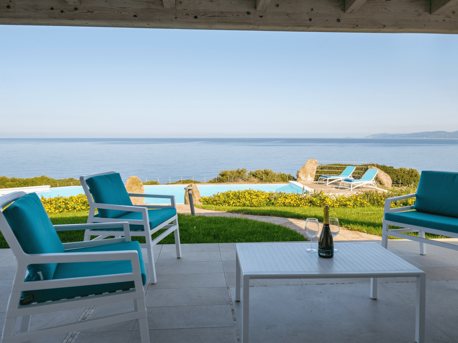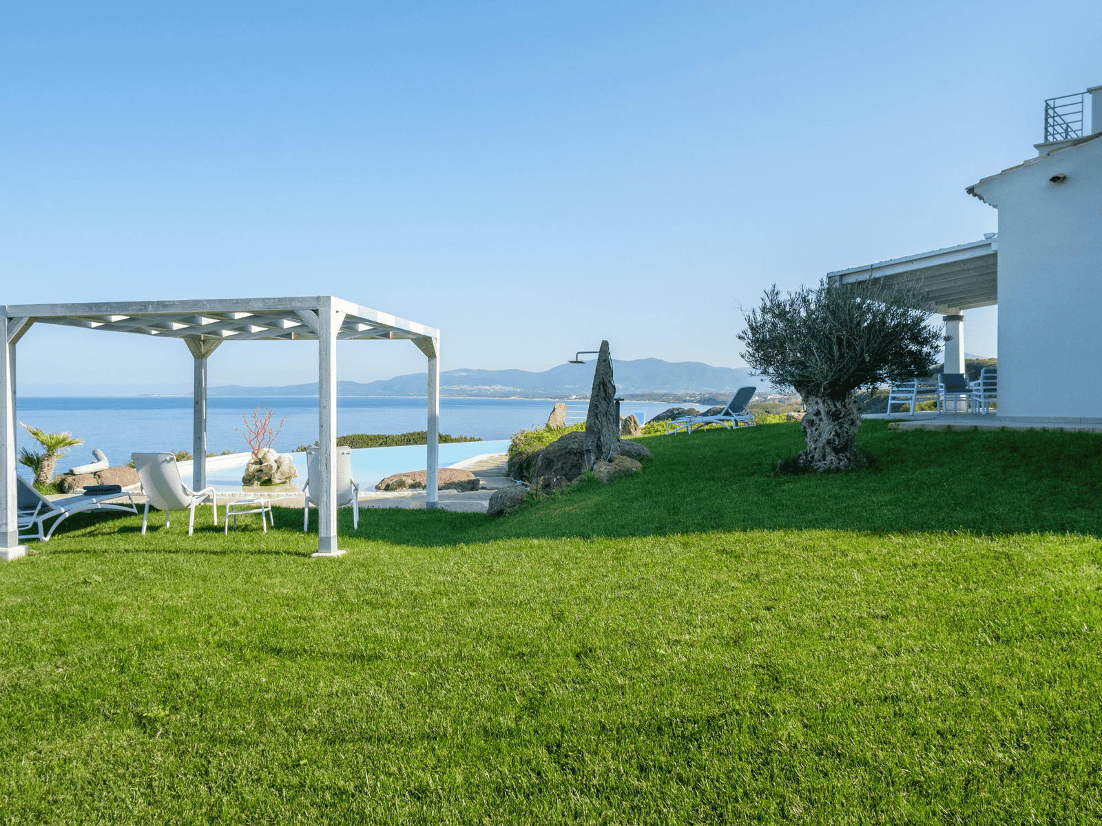 All’esterno domina la scena una splendida piscina a sfioro con acqua salata, dotata di area idromassaggio e perfettamente integrata nel paesaggio naturale. La villa è circondata da circa 20.000 mq di terreno privato, un’oasi verde che assicura riservatezza e scenari mozzafiato.