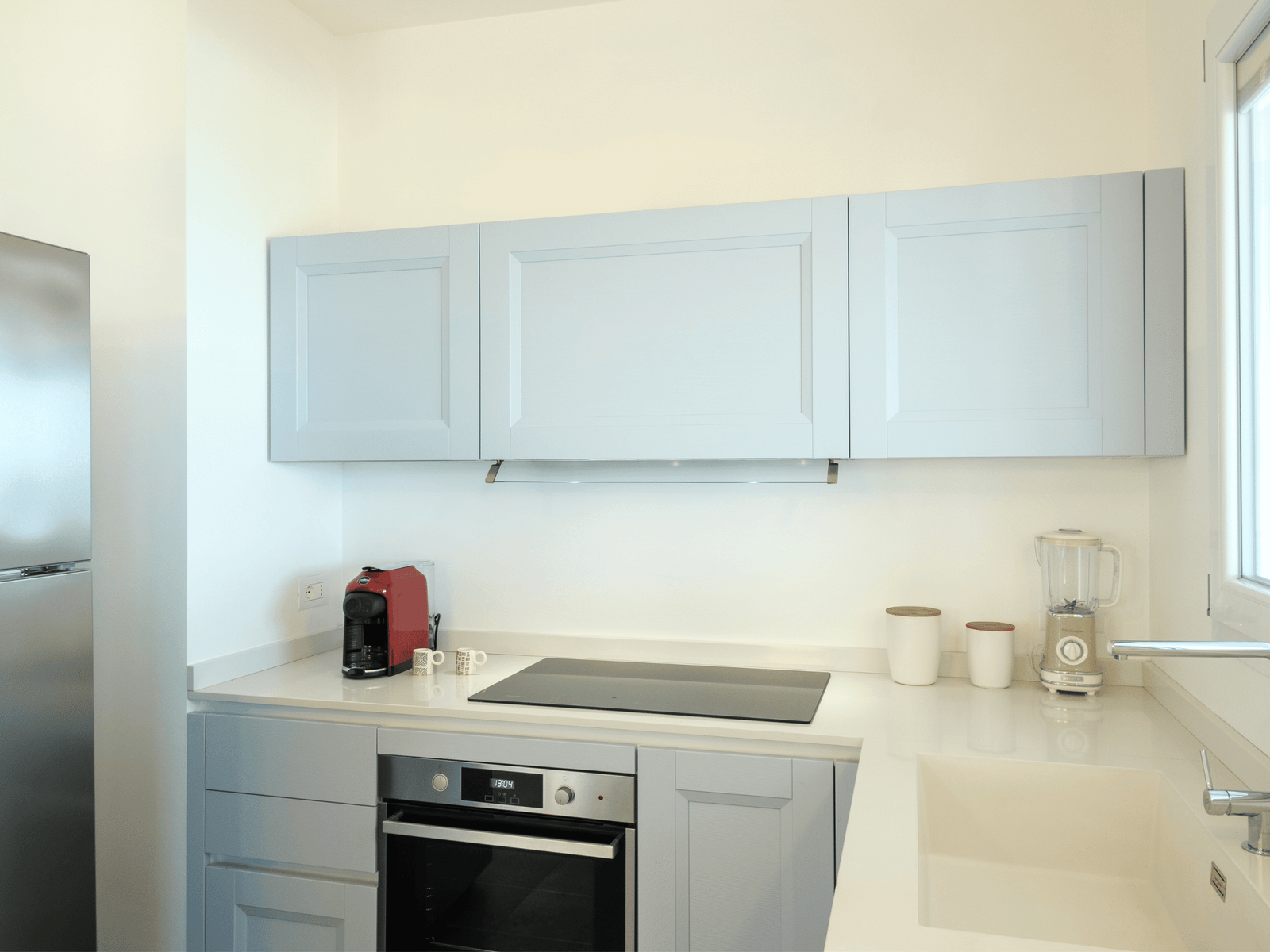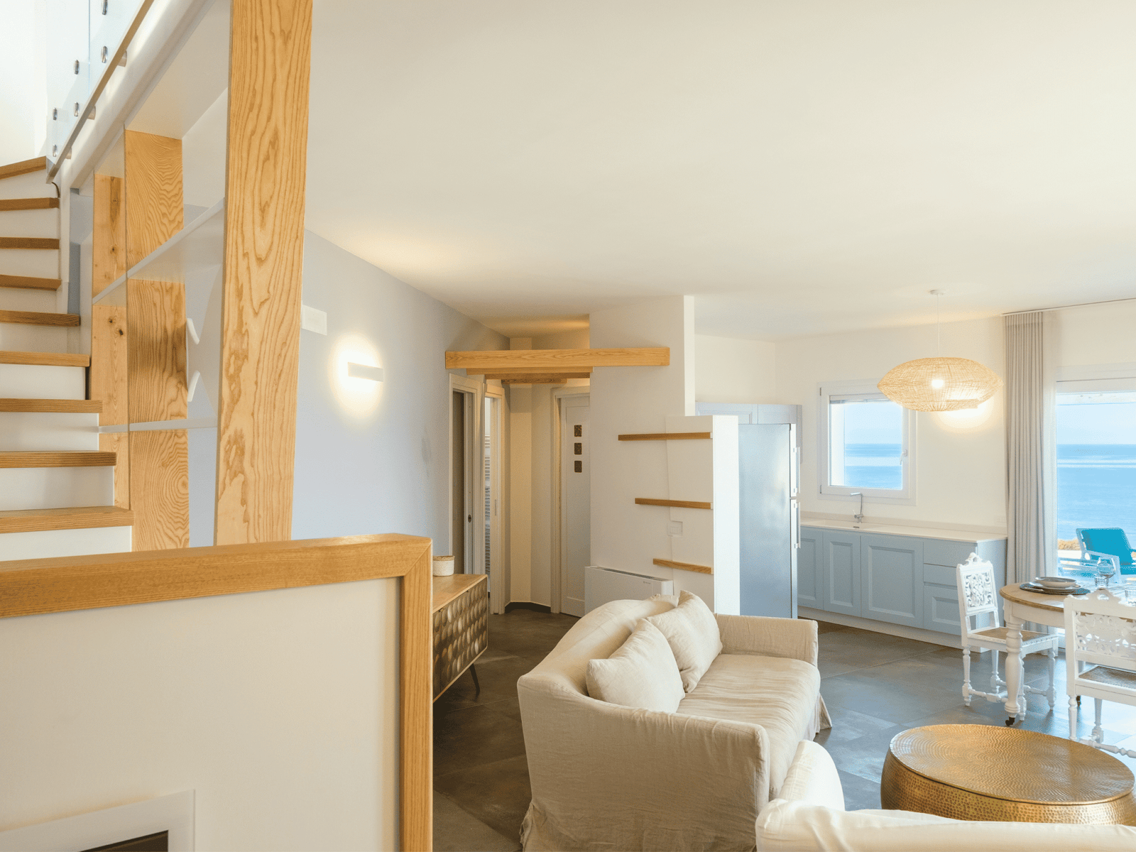 La villa si sviluppa su due livelli e combina design contemporaneo e materiali ricercati. Al piano terra si apre un’ampia zona living con cucina a vista, pensata per valorizzare la luce e la vista panoramica.