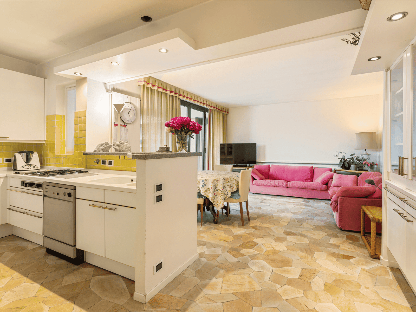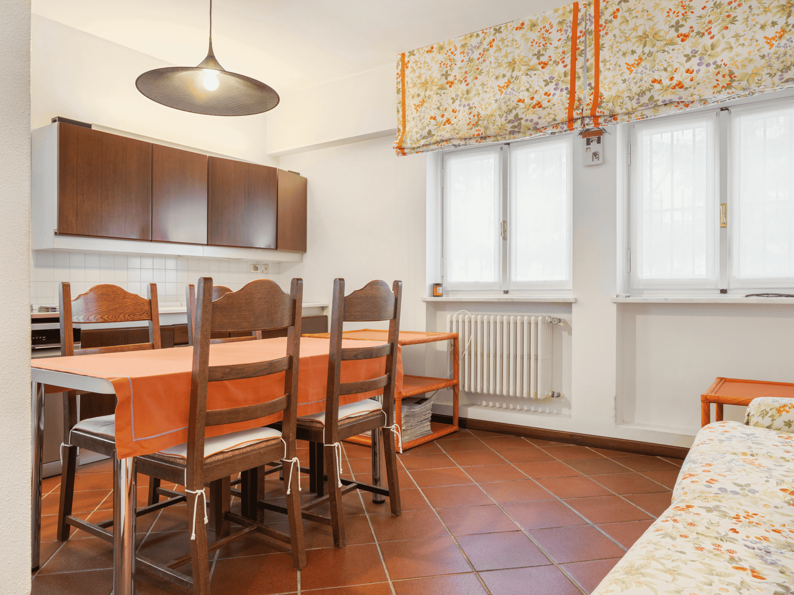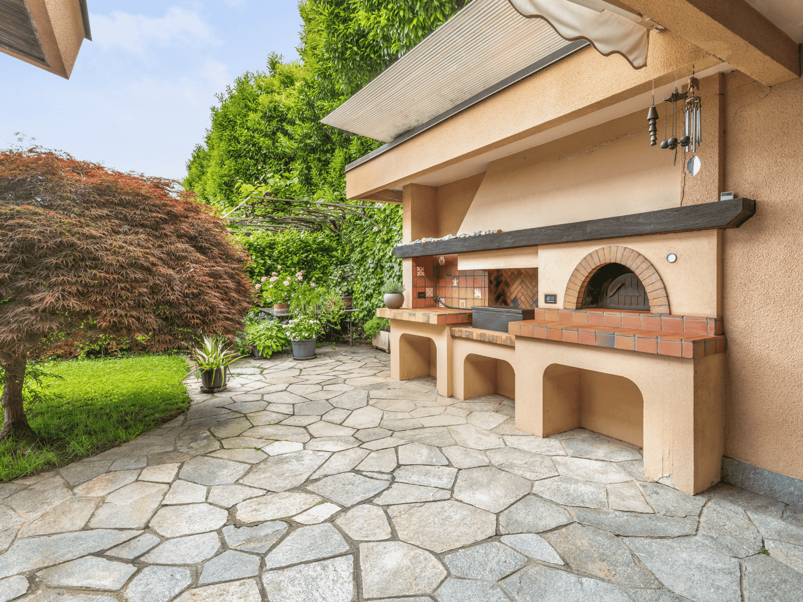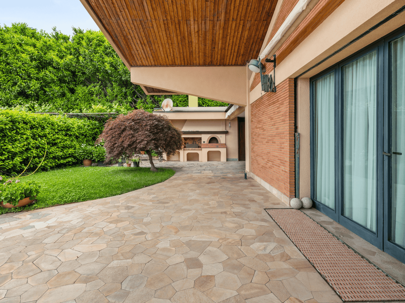 La cucina, ampia e funzionale, dialoga direttamente con il giardino, rendendo naturale l’utilizzo degli spazi esterni durante tutto l’anno.