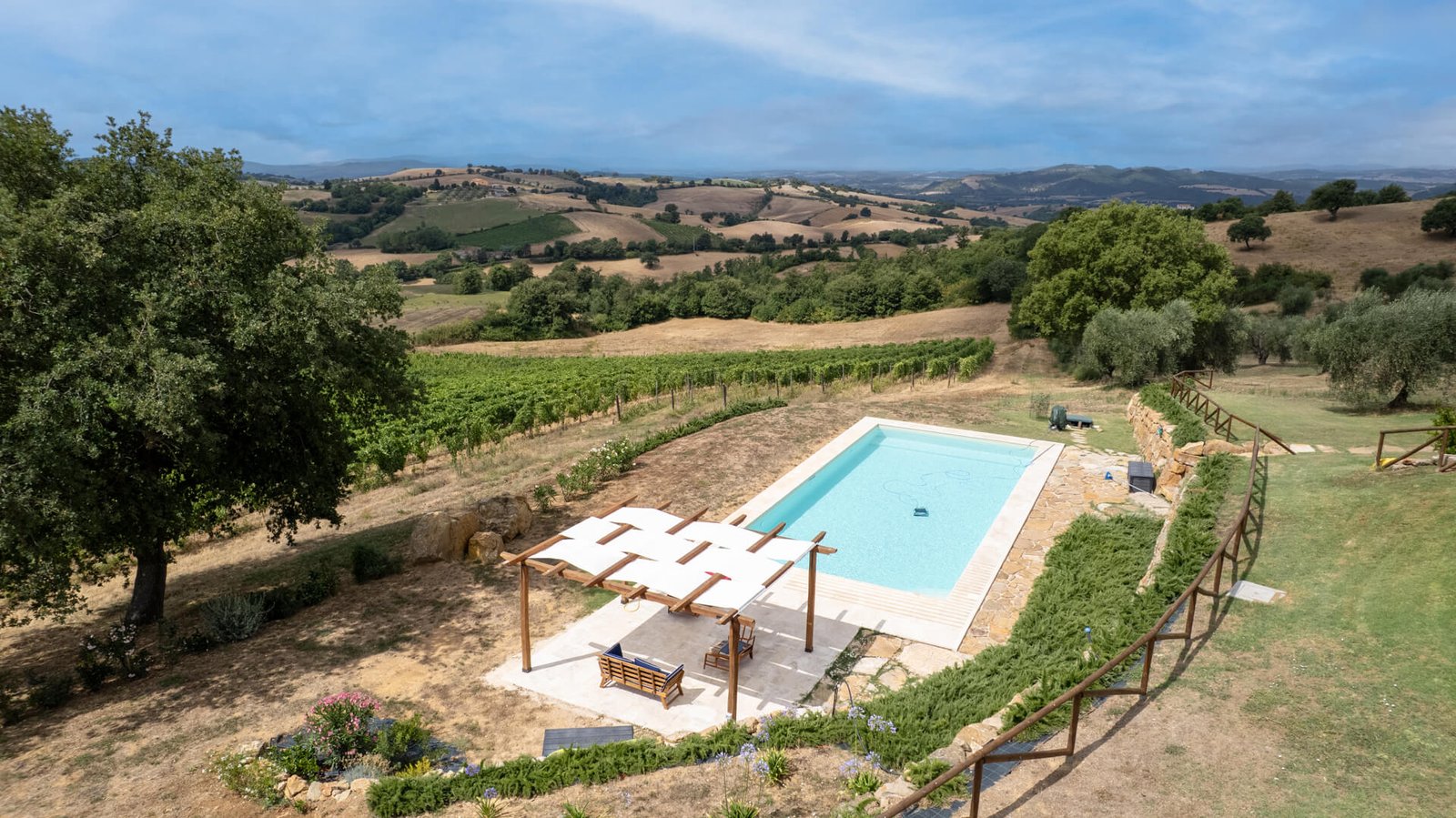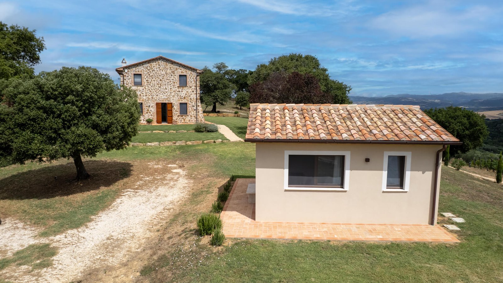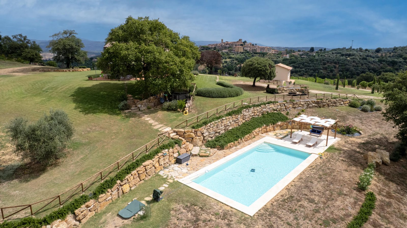 All’esterno, uno splendido parco con piante autoctone ed alberi da frutto circonda i fabbricati e accoglie una magnifica piscina infinity di 13×6 mq., ideale per rinfrescarsi durante le calde giornate estive. Questa straordinaria proprietà è anche un’azienda biologica certificata di circa 15 ettari di terreni, con 350 piante di olivo in produzione di cui 100 secolari oltre a 3 ettari dedicati a vigneto, ulteriore elemento di prestigio e tradizione.