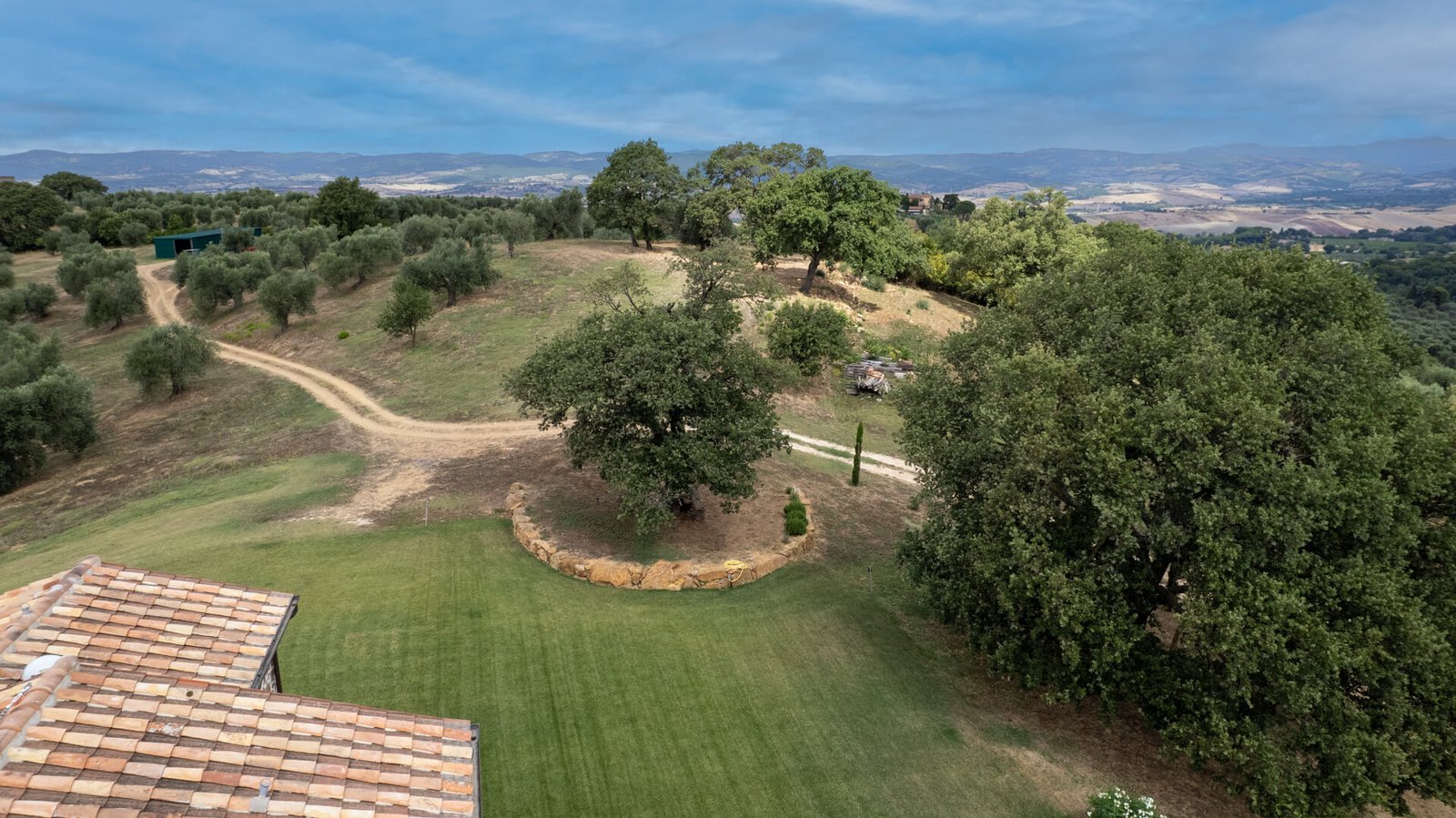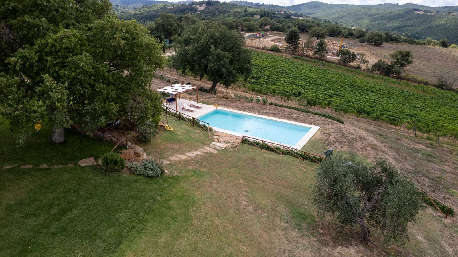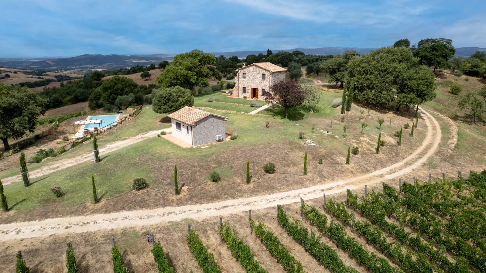 All’esterno, uno splendido parco con piante autoctone ed alberi da frutto circonda i fabbricati e accoglie una magnifica piscina infinity di 13×6 mq., ideale per rinfrescarsi durante le calde giornate estive. Questa straordinaria proprietà è anche un’azienda biologica certificata di circa 15 ettari di terreni, con 350 piante di olivo in produzione di cui 100 secolari oltre a 3 ettari dedicati a vigneto, ulteriore elemento di prestigio e tradizione.