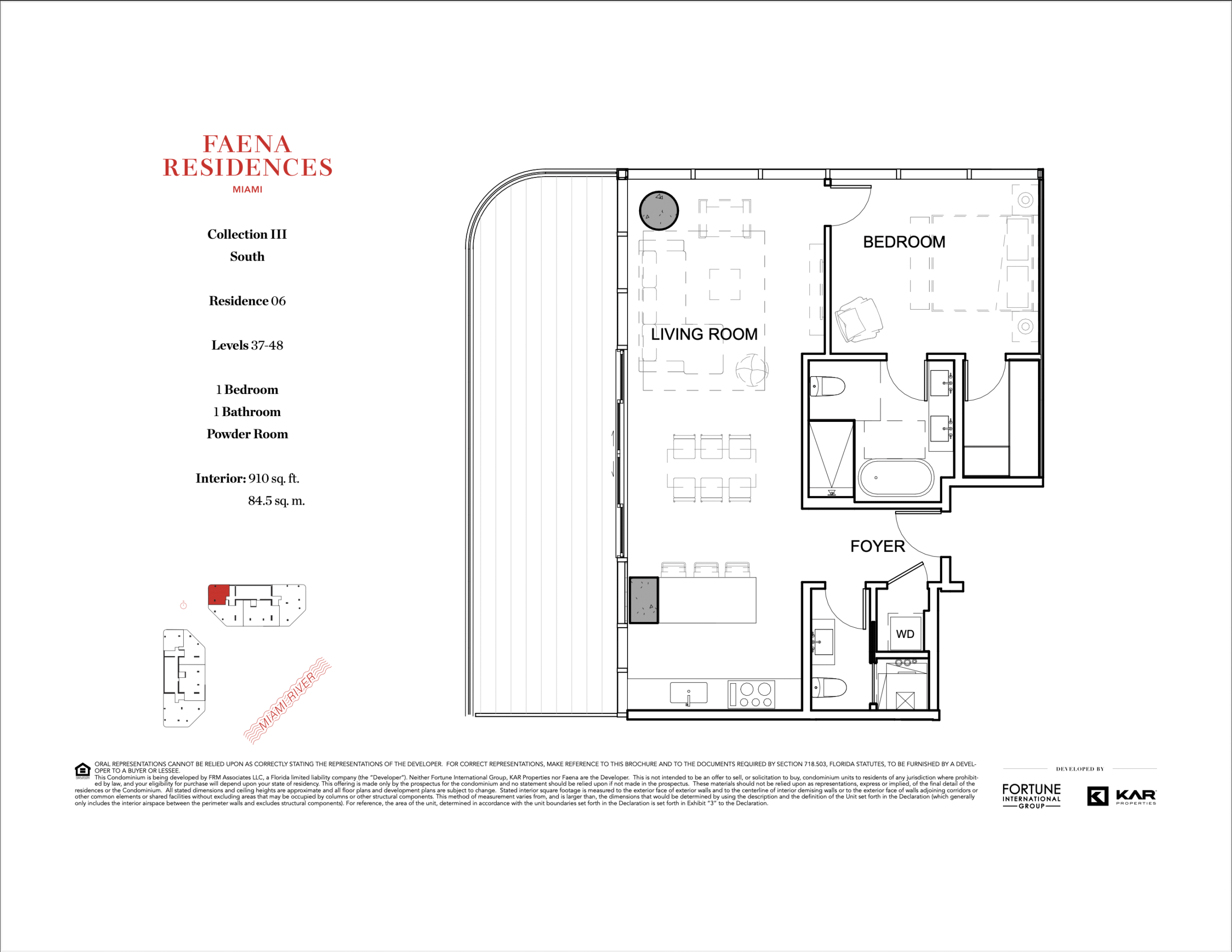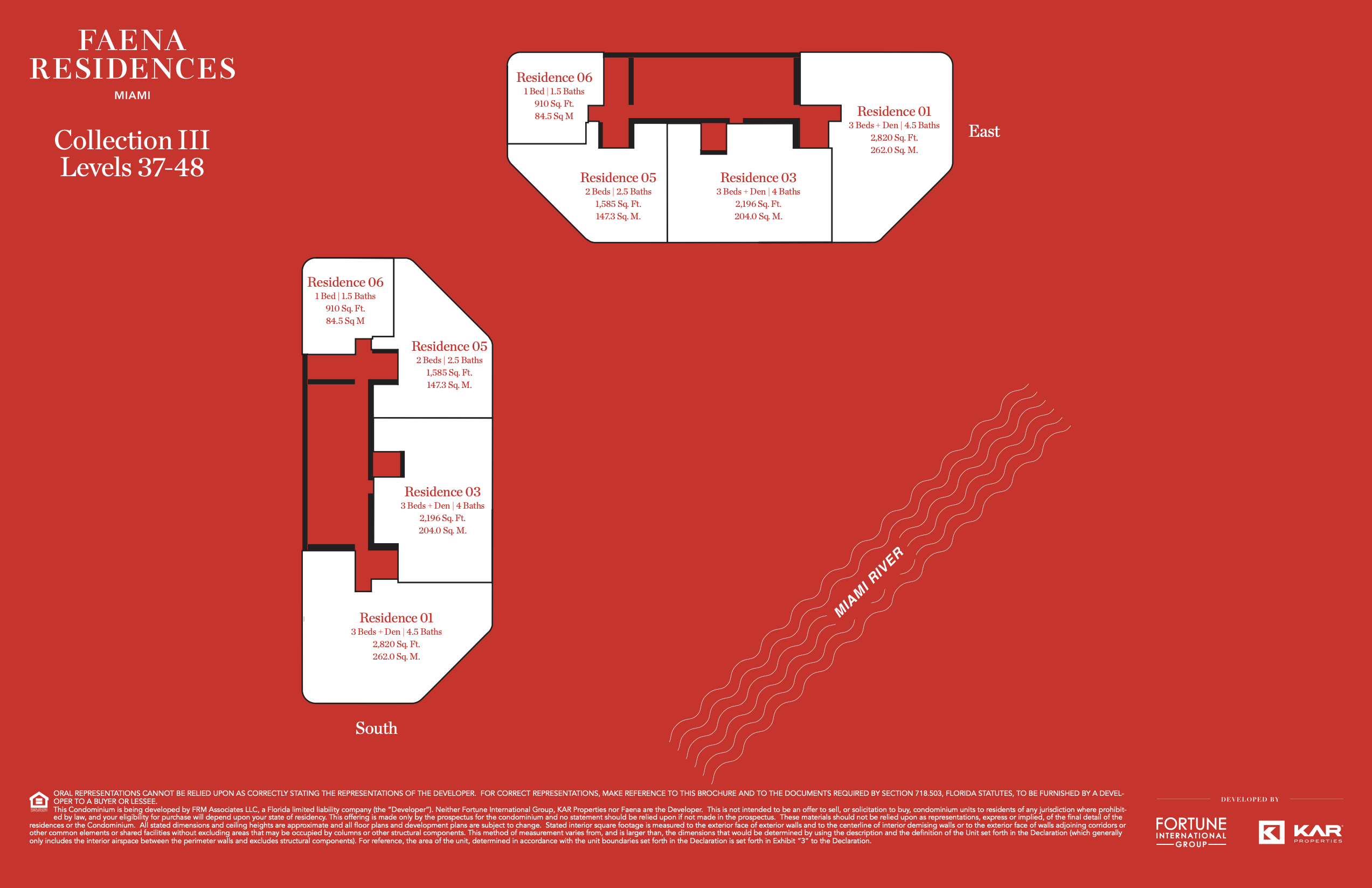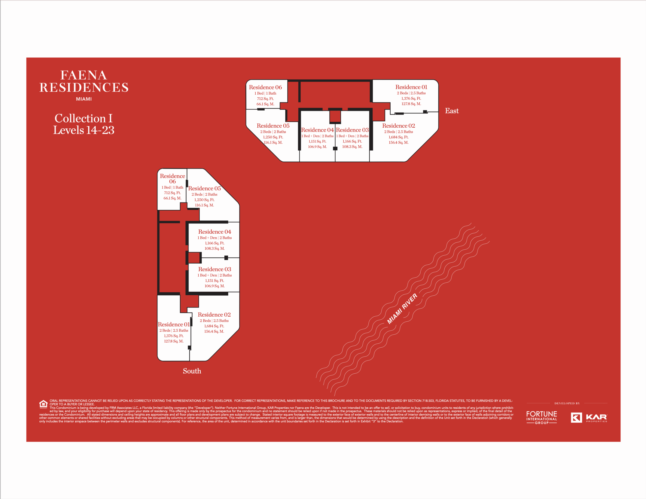 Un pied-à-terre di carattere affacciato sul Miami River, tra Brickell e Downtown. Le residenze 1BR (66–85 m² ca.), con living luminoso e zona notte separata, offrono vetrate a tutta altezza, layout essenziali e flussi spaziali intelligenti; in selezionati piani alti (Levels 37–48) è presente anche un powder room (bagno ospiti).