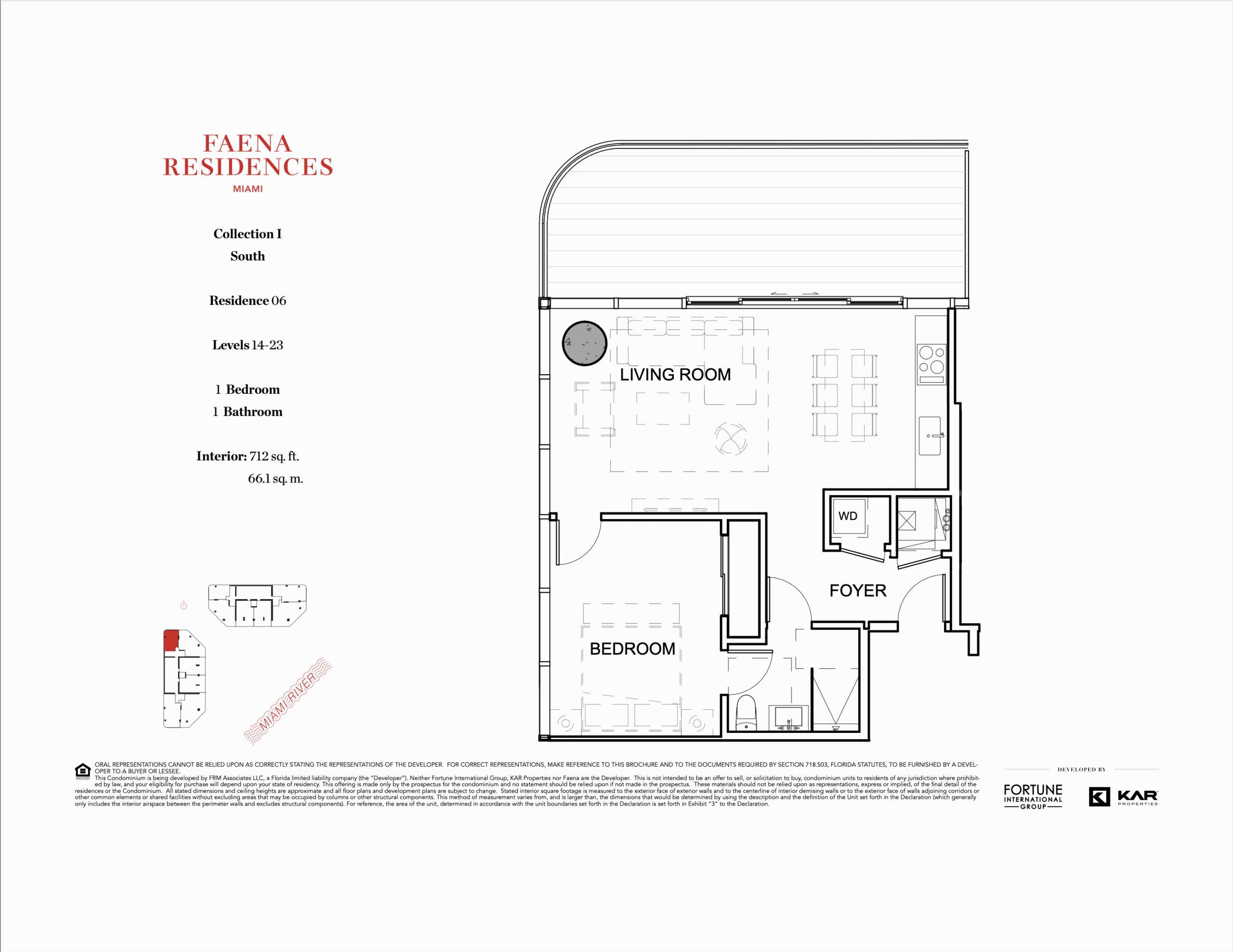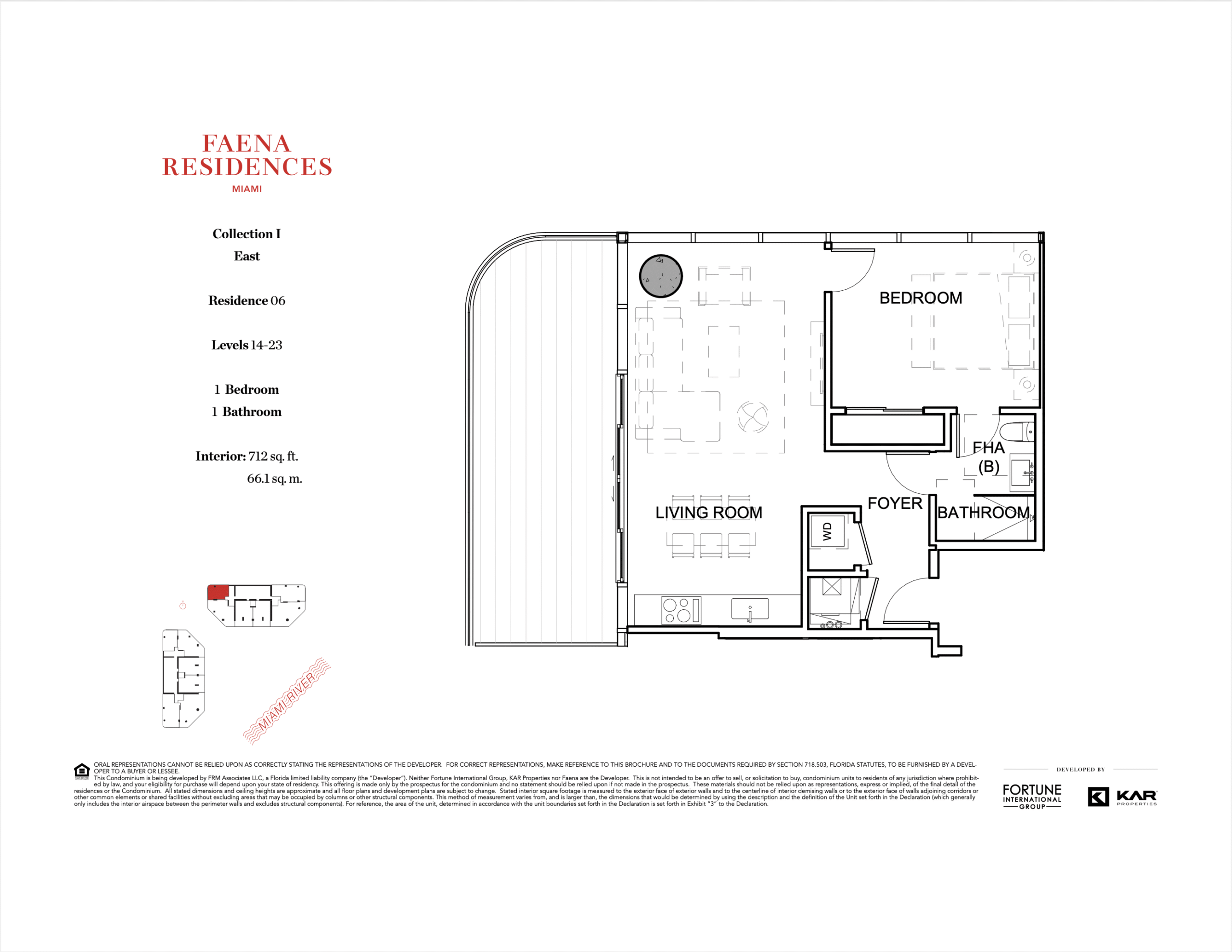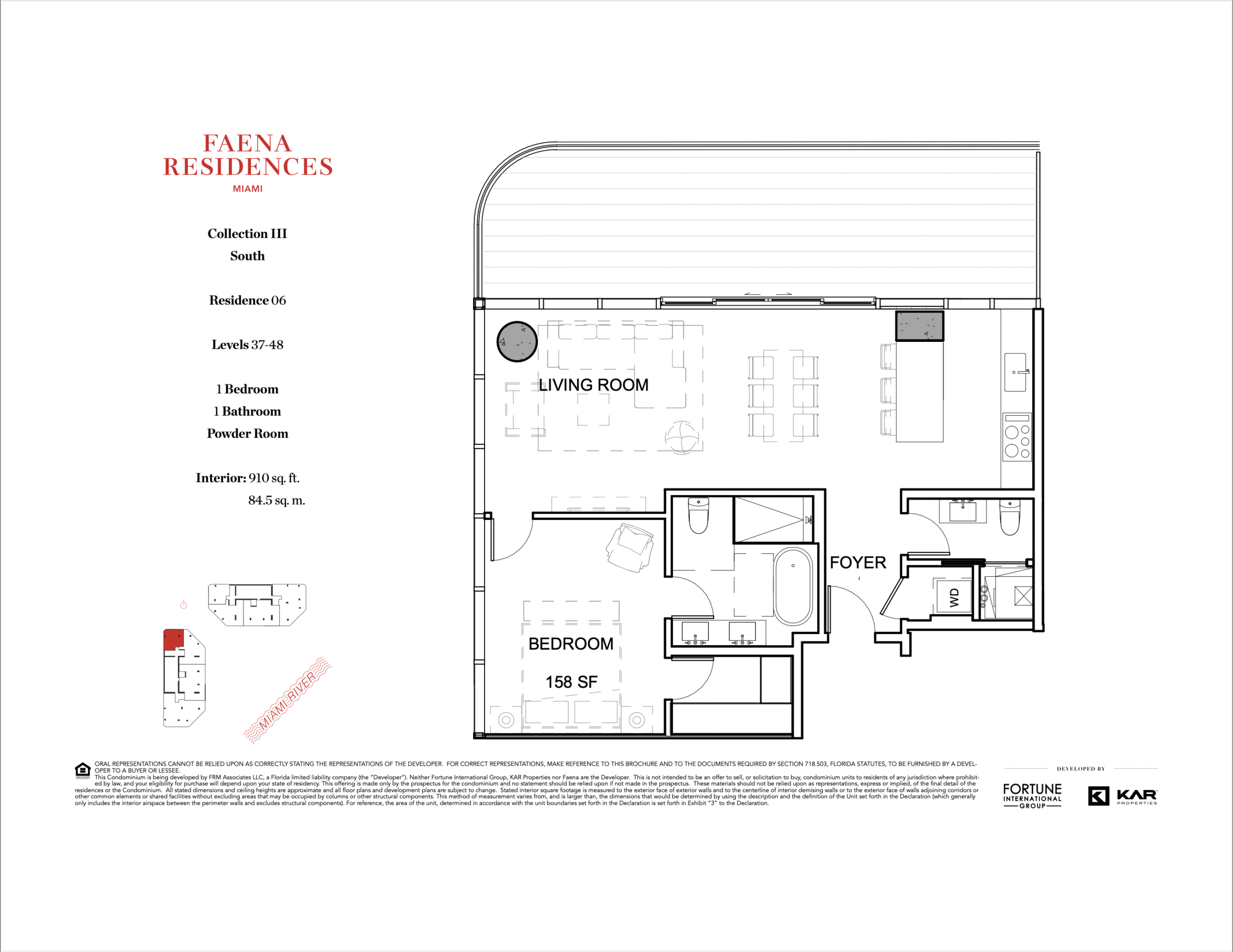Un pied-à-terre di carattere affacciato sul Miami River, tra Brickell e Downtown. Le residenze 1BR (66–85 m² ca.), con living luminoso e zona notte separata, offrono vetrate a tutta altezza, layout essenziali e flussi spaziali intelligenti; in selezionati piani alti (Levels 37–48) è presente anche un powder room (bagno ospiti).