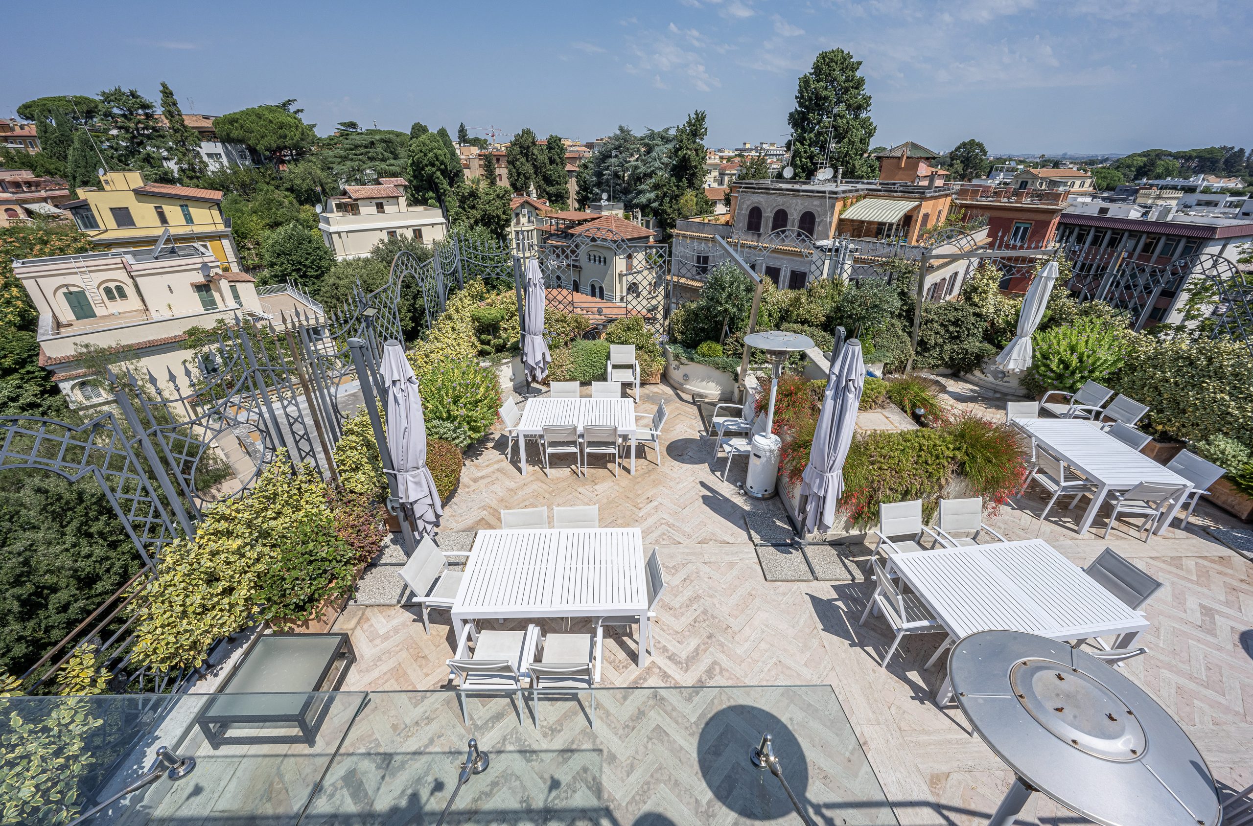 La superficie di circa 1.650 mq si sviluppa su tre livelli fuori terra, un seminterrato e un suggestivo roof garden con vista spettacolare sulla capitale, valorizzato da una piscina che crea un’atmosfera unica, ideale per eventi esclusivi o momenti di relax.