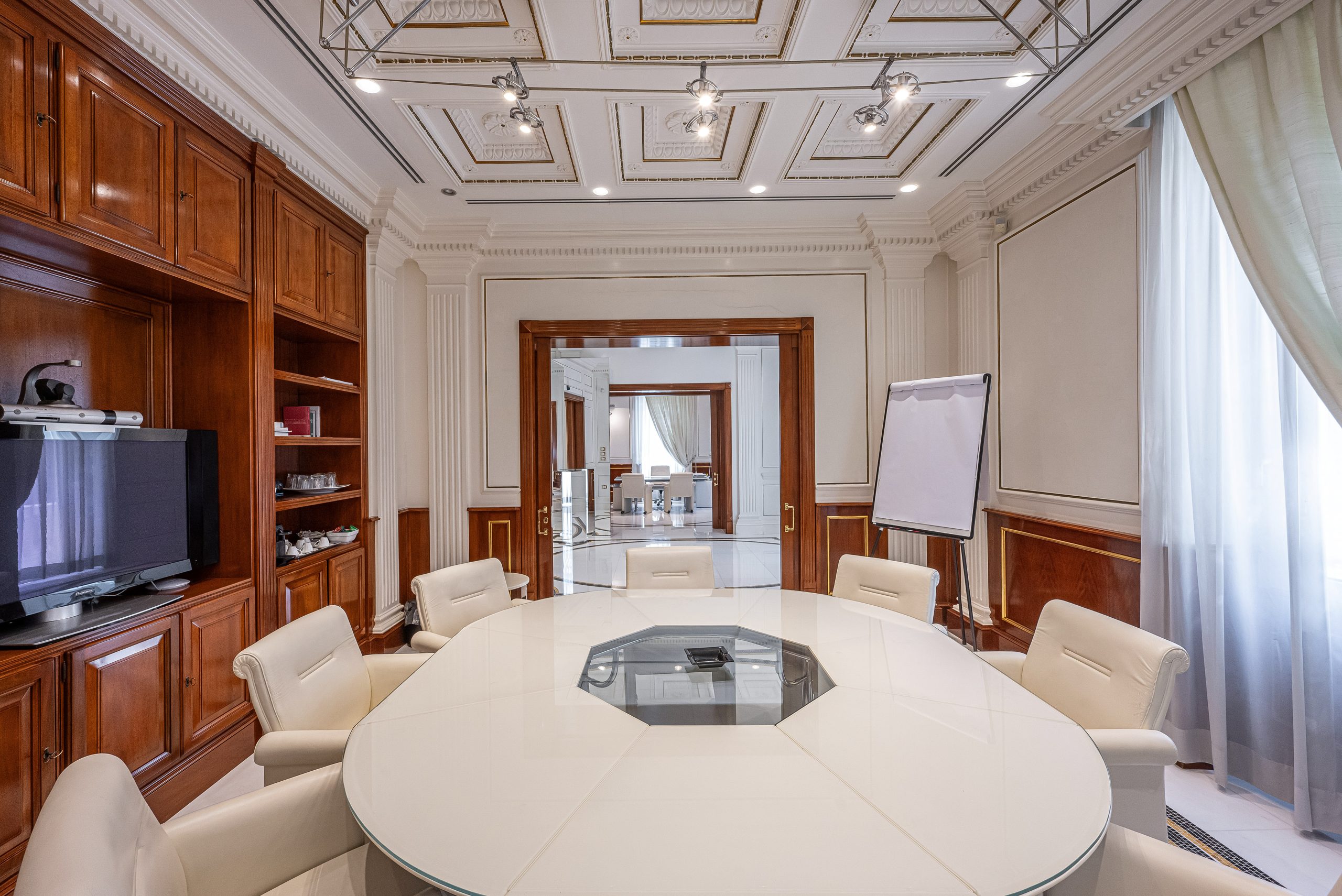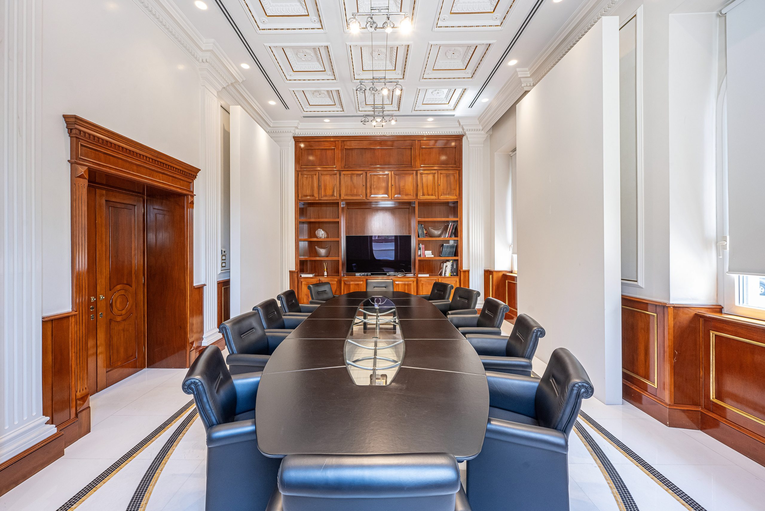 Al livello superiore, gli uffici presidenziali con reception, oltre a due sale riunioni, offrono ambienti di alta rappresentanza. Il secondo piano ospita altri sei uffici direzionali, mentre il terzo ed ultimo piano si trasforma in una raffinata dimora adibita a prestigiosa foresteria, con ampi saloni, due camere da letto, cucina e bagni.
