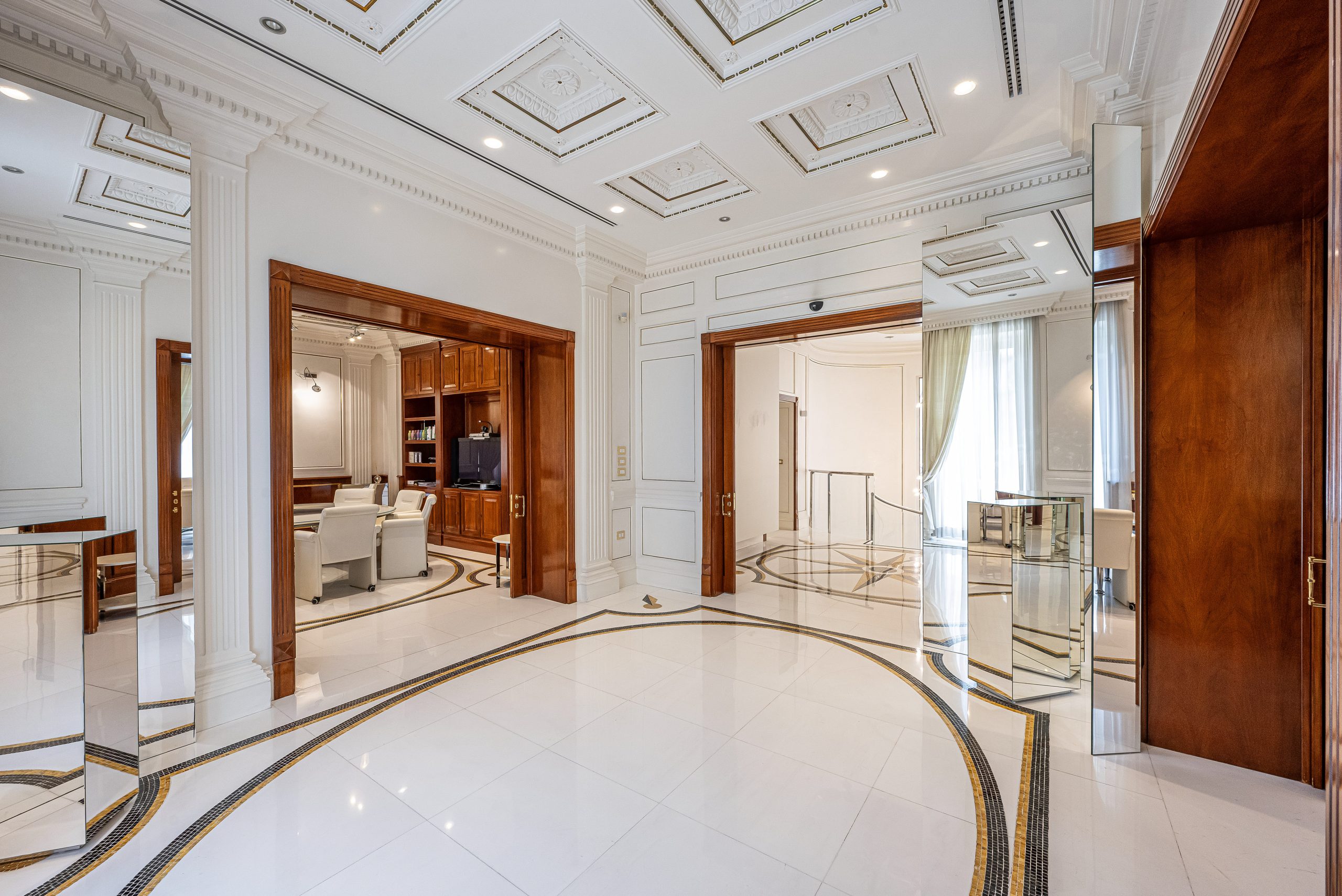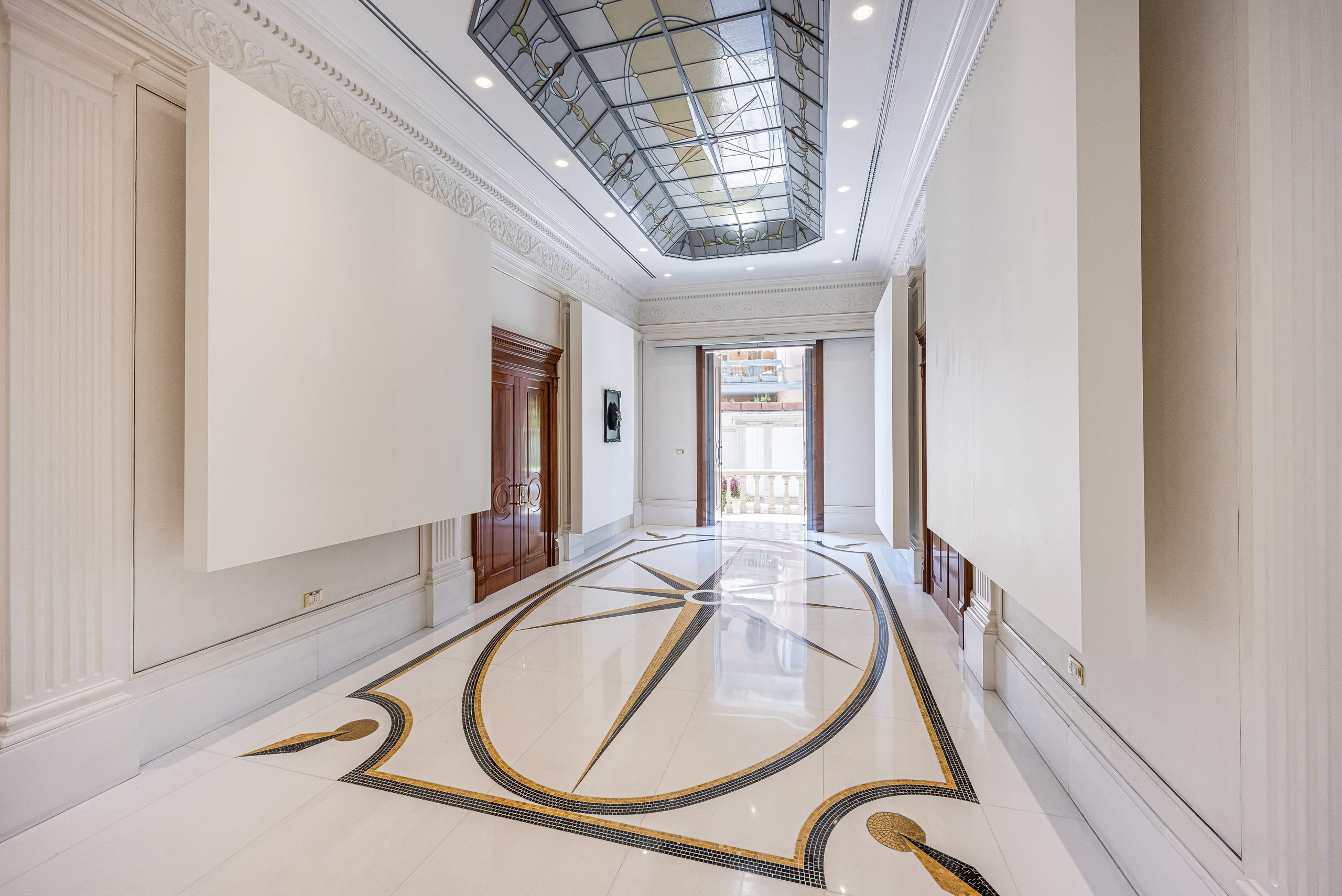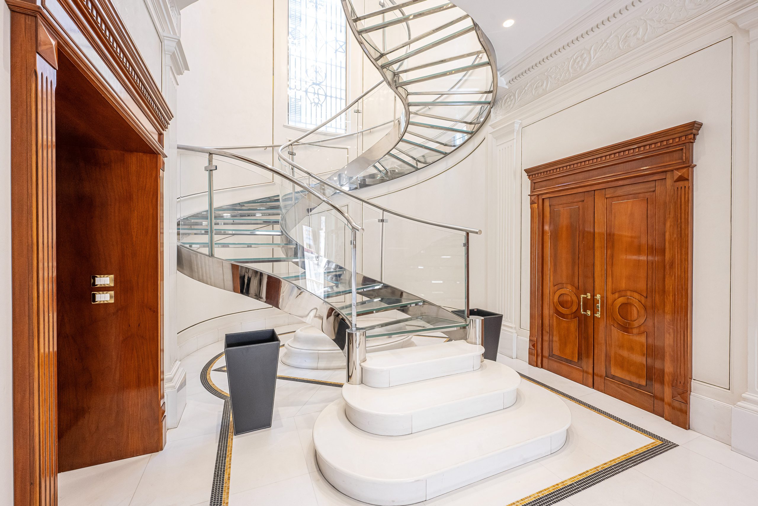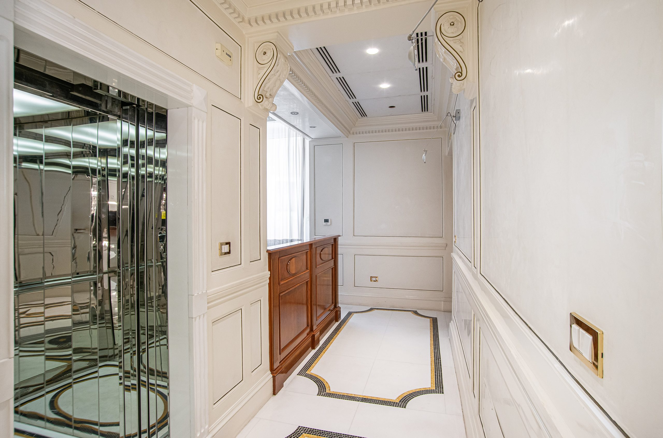 Il palazzo dispone di due ingressi carrabili con spazio esterno per numerosi posti auto e moto. All’interno, si aprono tre ingressi, tra cui quello principale che accoglie in una hall di grande fascino, impreziosita da una scala in cristallo elicoidale che dona un tocco scenografico. Ogni piano è collegato da un elegante ascensore a specchi. Al piano si trovano due uffici direzionali e una splendida sala riunioni. I soffitti a cassettoni, le boiserie, i marmi pregiati anche nei servizi, rendono l’ambiente estremamente elegante.