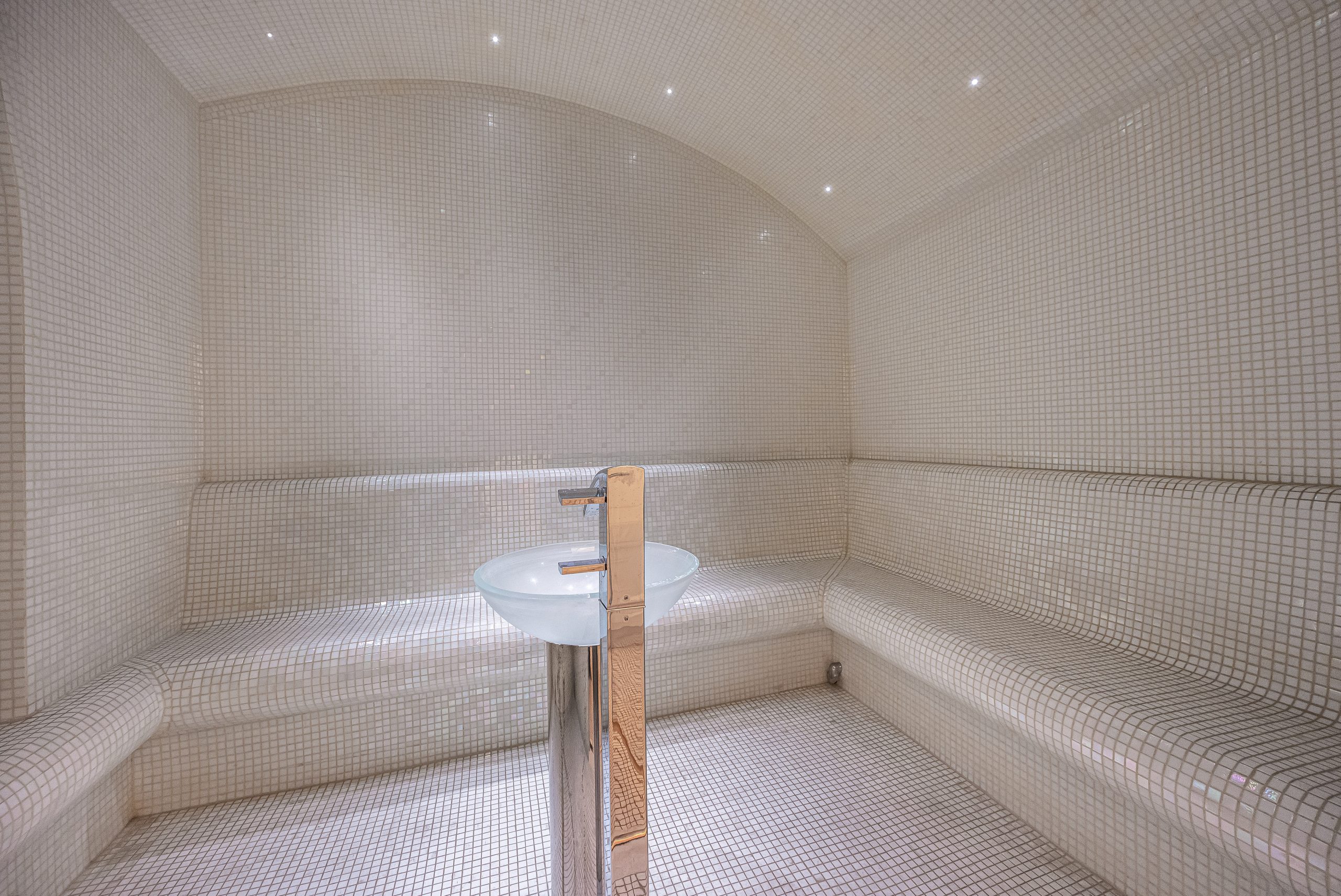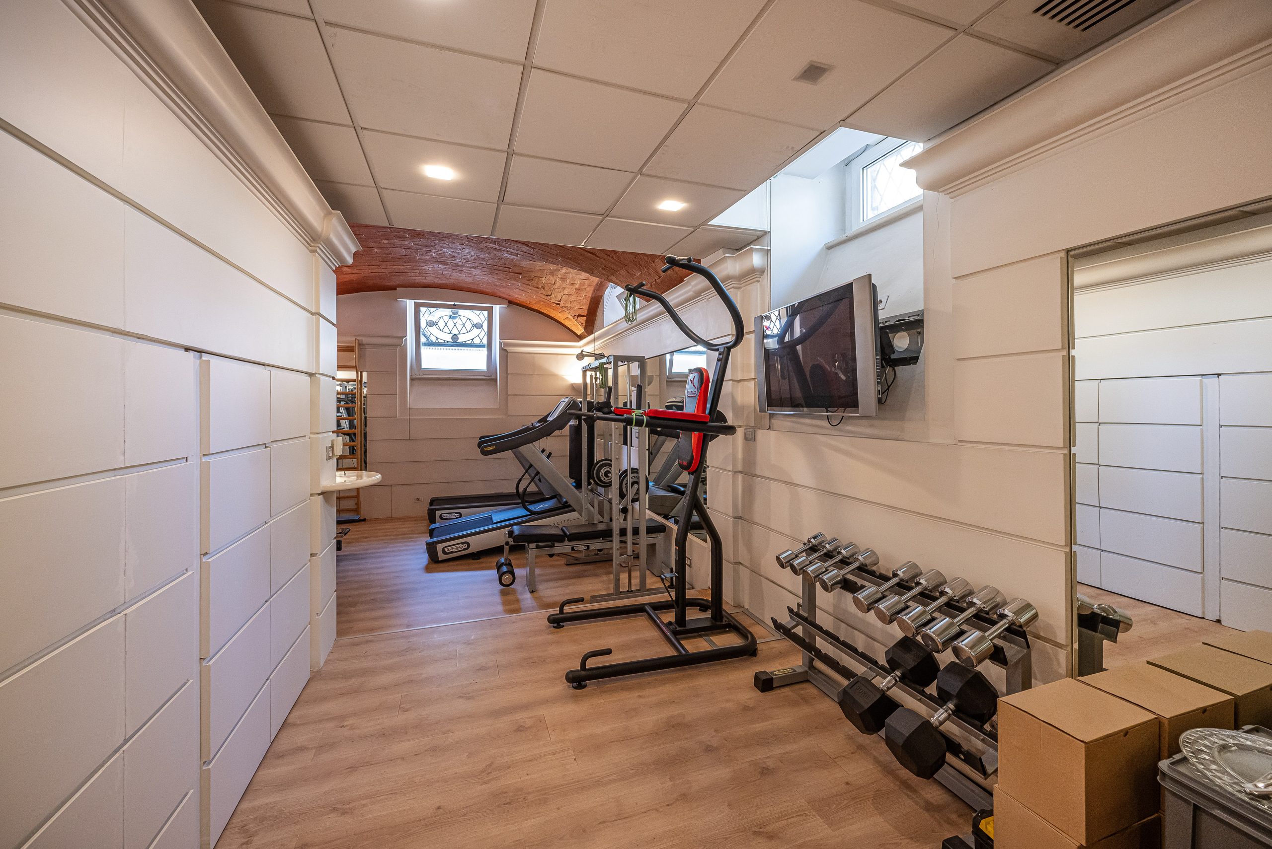 Al seminterrato si trovano ulteriori spazi uffici e una zona wellness con palestra e bagno turco, mentre all’esterno una dependance su due livelli e un terrazzo completano la proprietà .