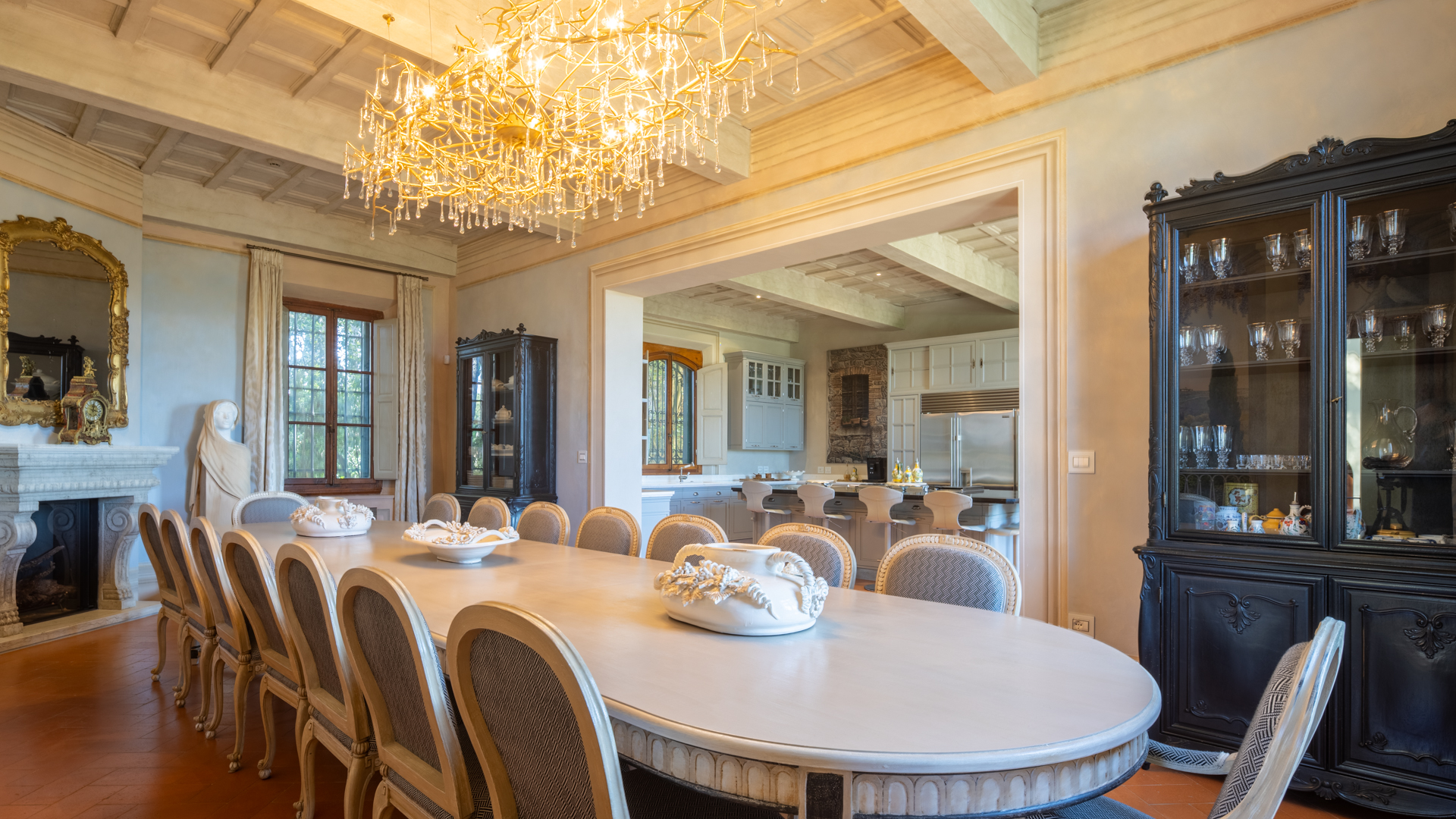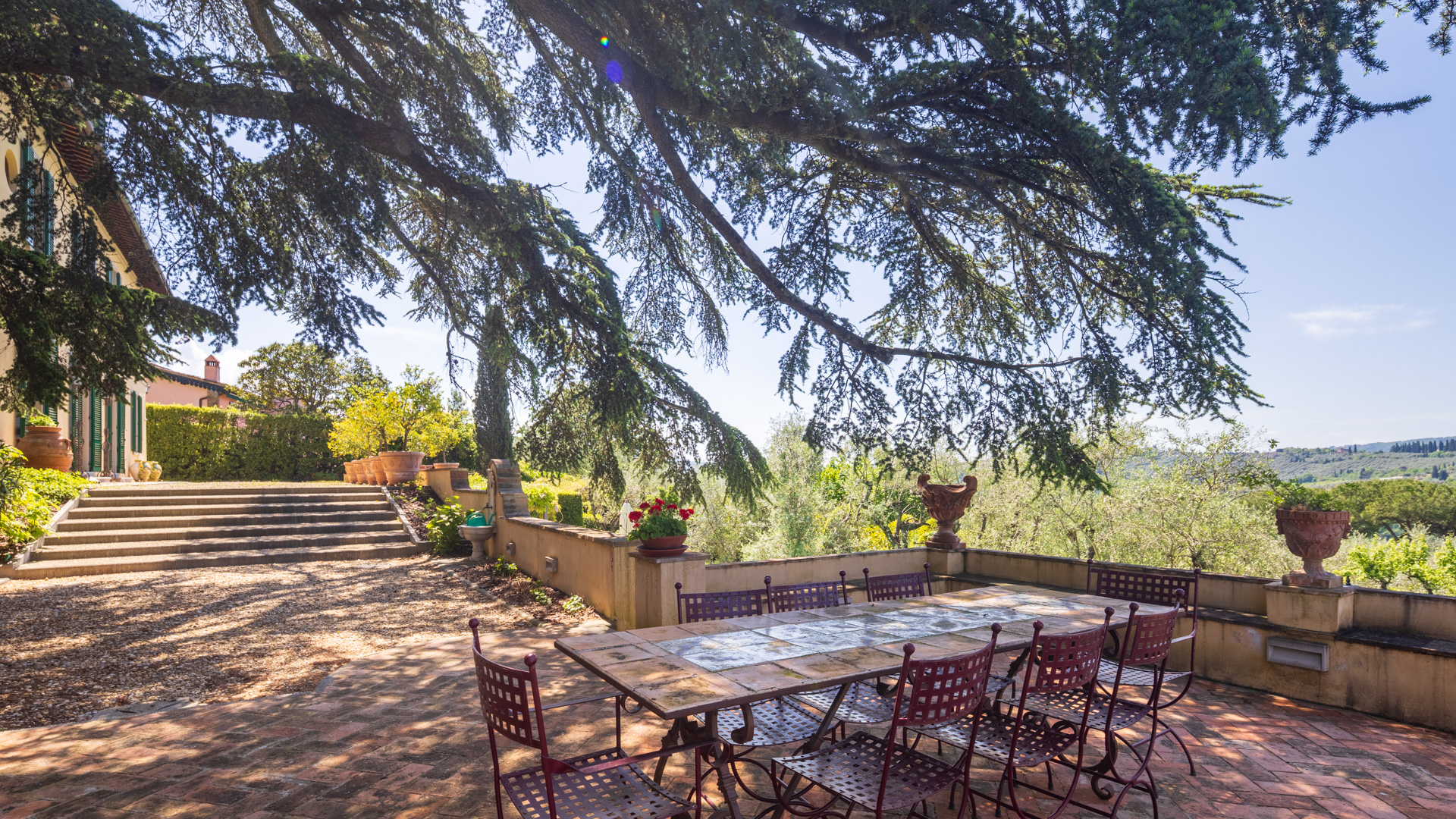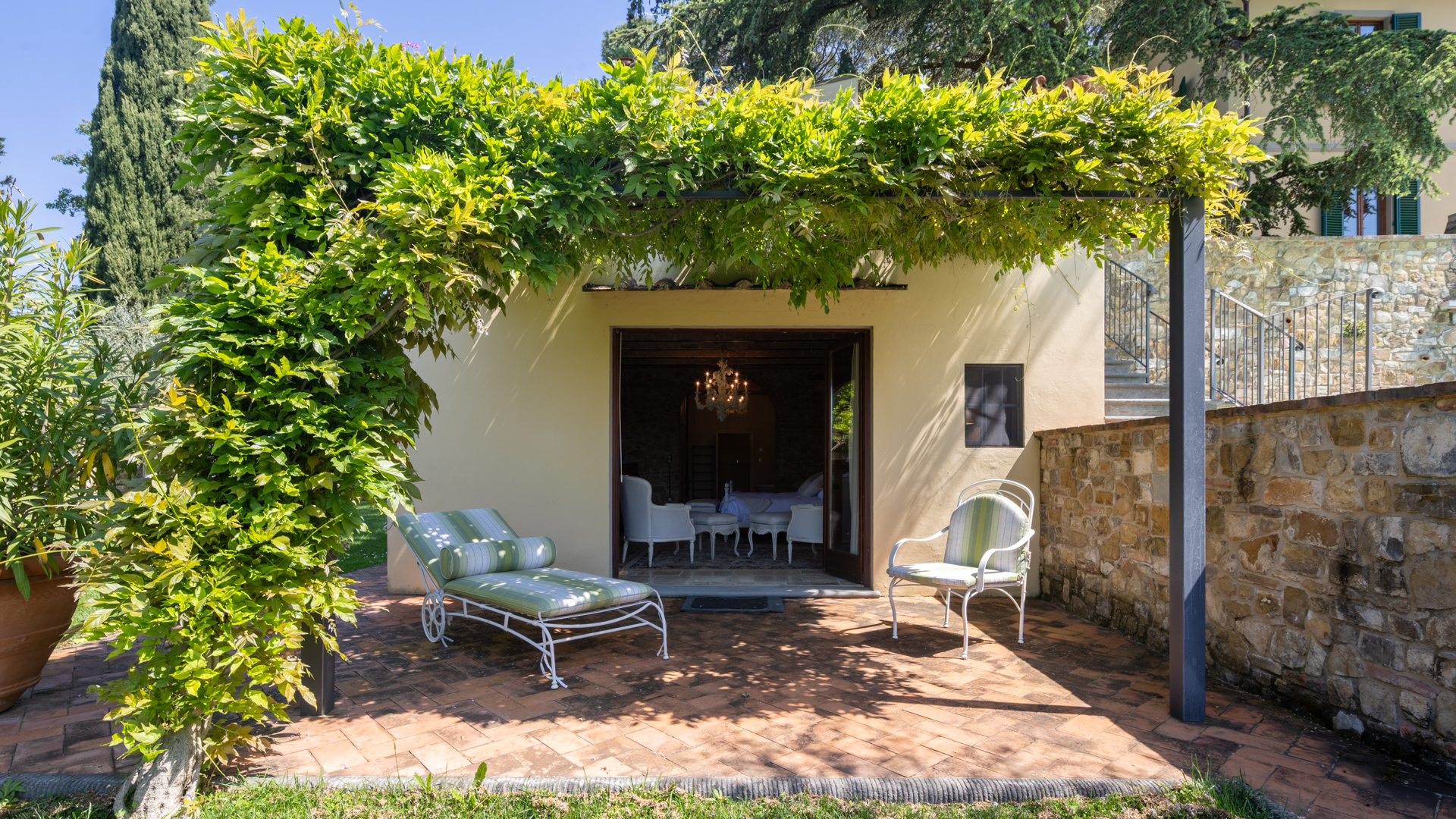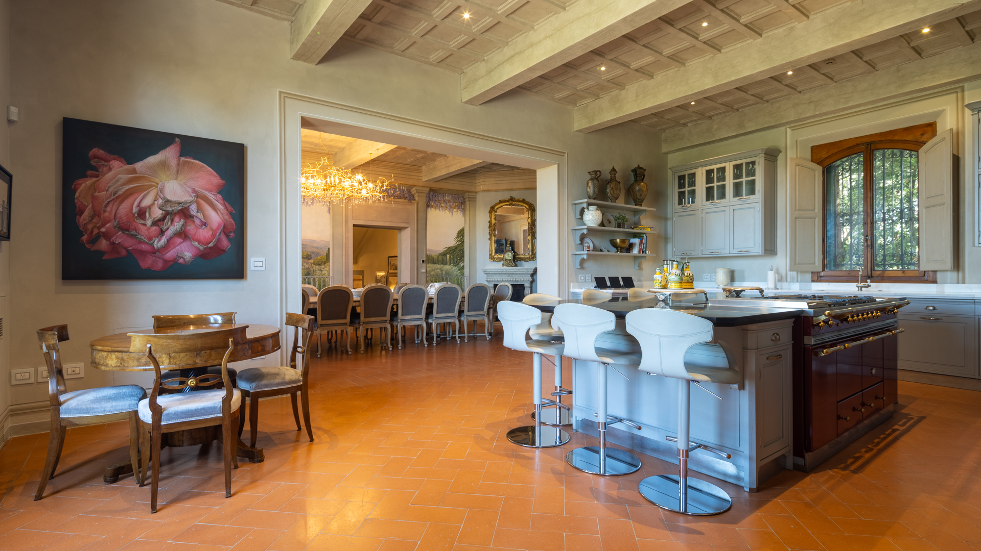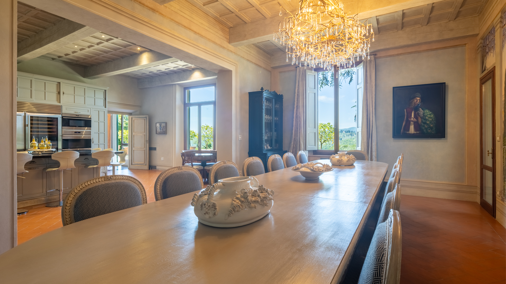 Gli interni si distinguono per la raffinata successione di ambienti accoglienti e luminosi, pensati per unire fascino d’epoca e funzionalità quotidiana. La cucina open-space di livello professionale, con zona pranzo, si apre sul giardino curato, arricchito da piante di limone in vasi di terracotta: un invito alla vita all’aperto in perfetto stile toscano.