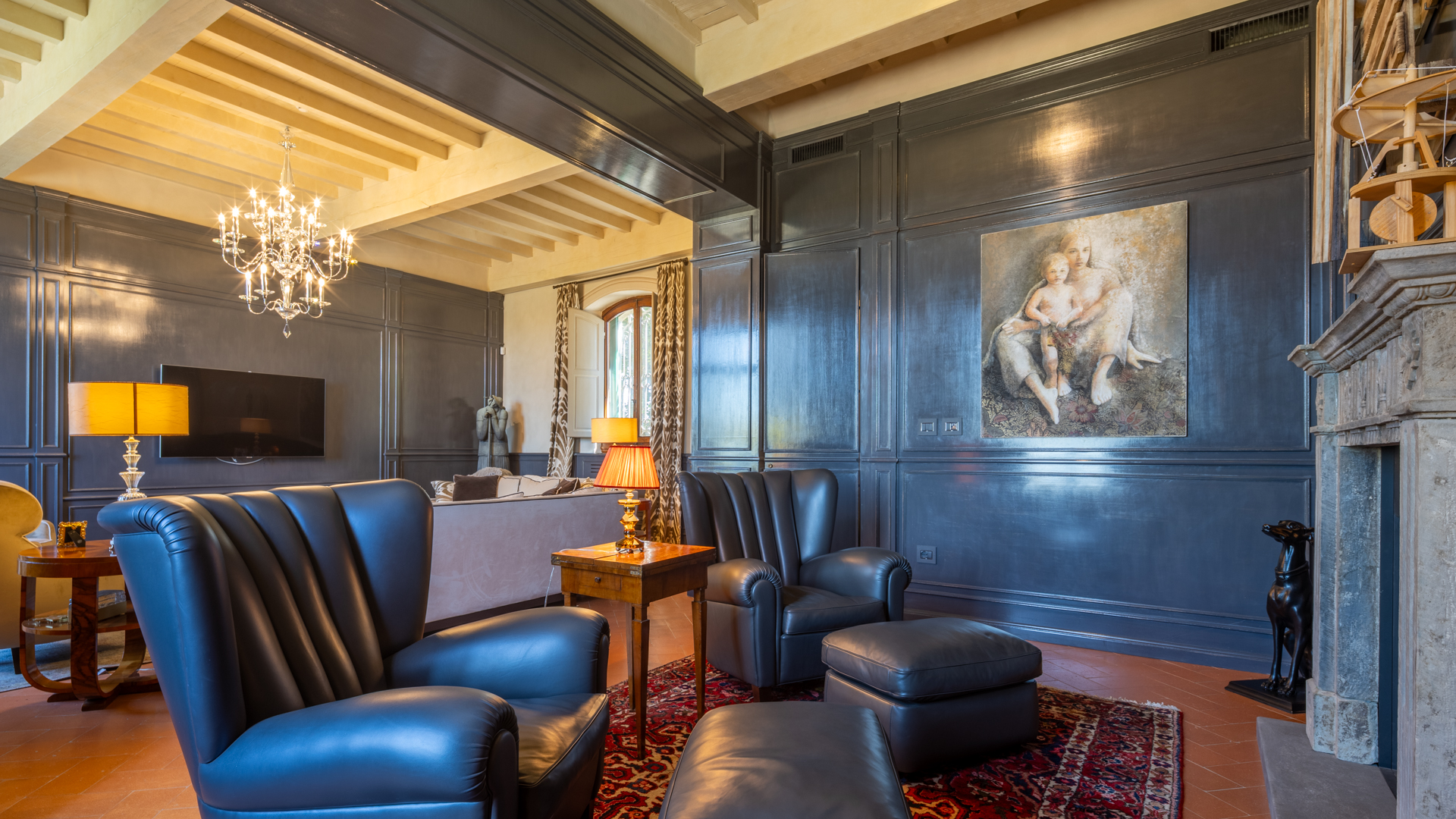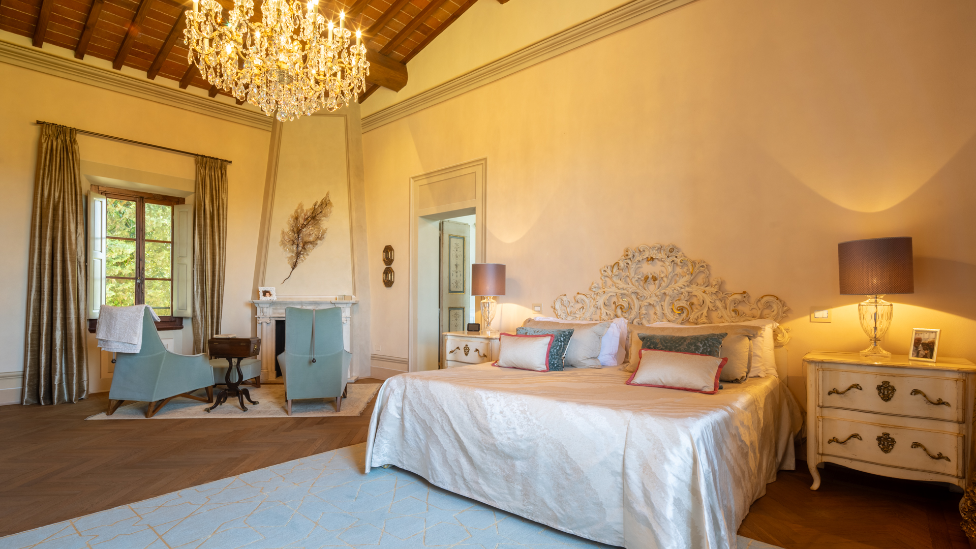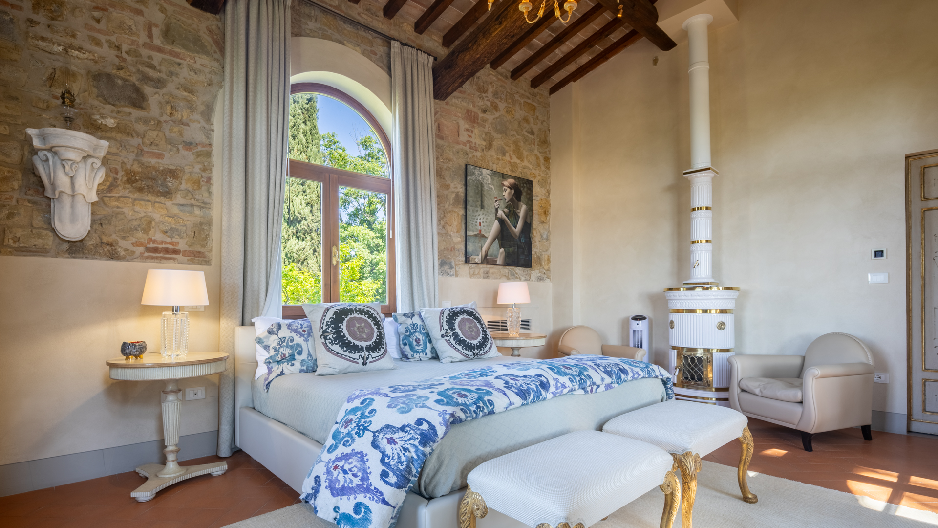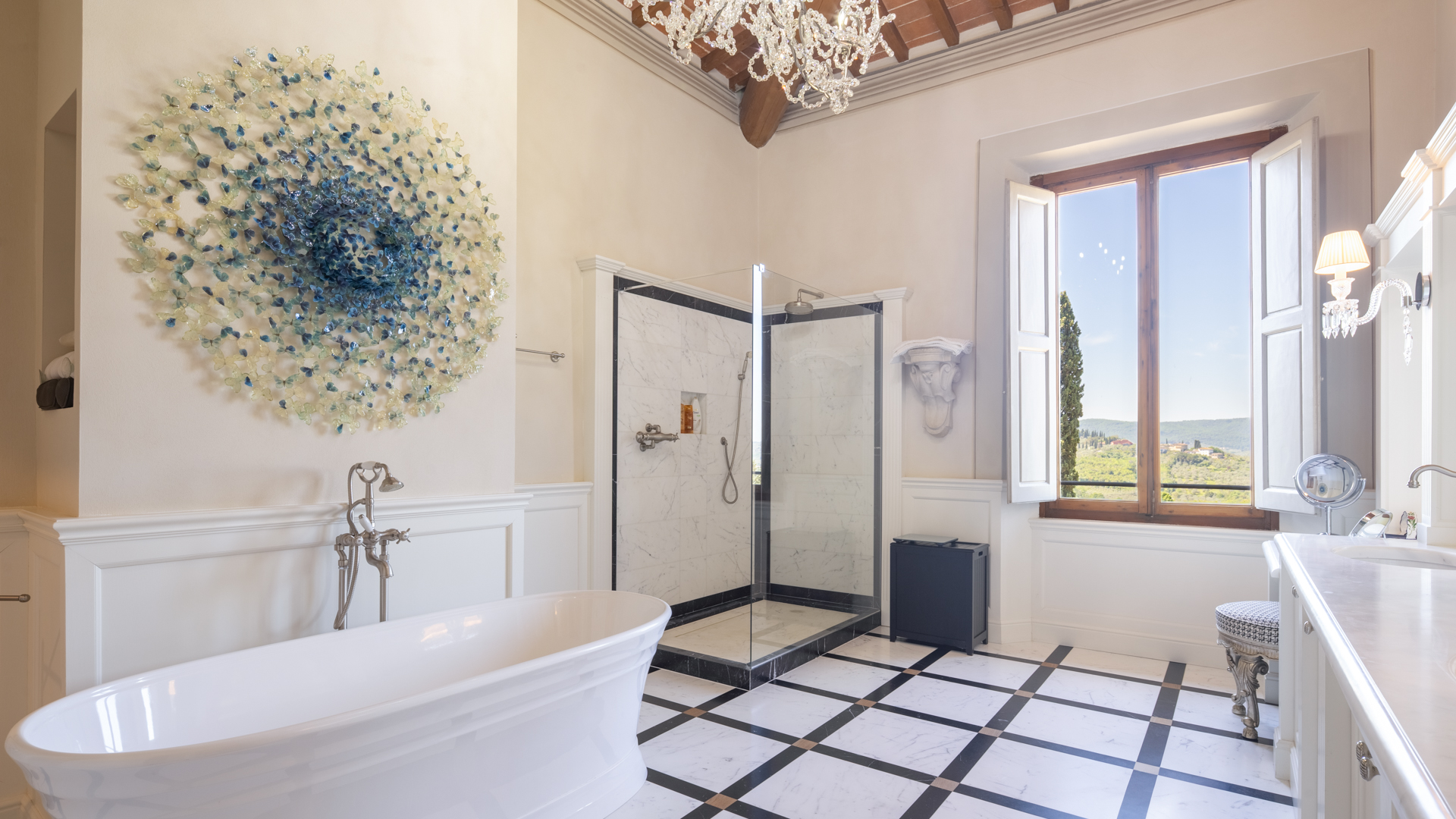 Al piano superiore, la suite padronale con grande bagno è affiancata da altre quattro camere e un salottino con accesso a una veranda panoramica affacciata sul parco privato. All’ultimo piano, la storica torre ospita oggi un luminoso salotto d’arte con vista a 360° sulle verdi colline fiorentine.