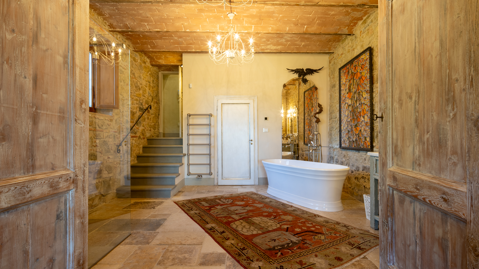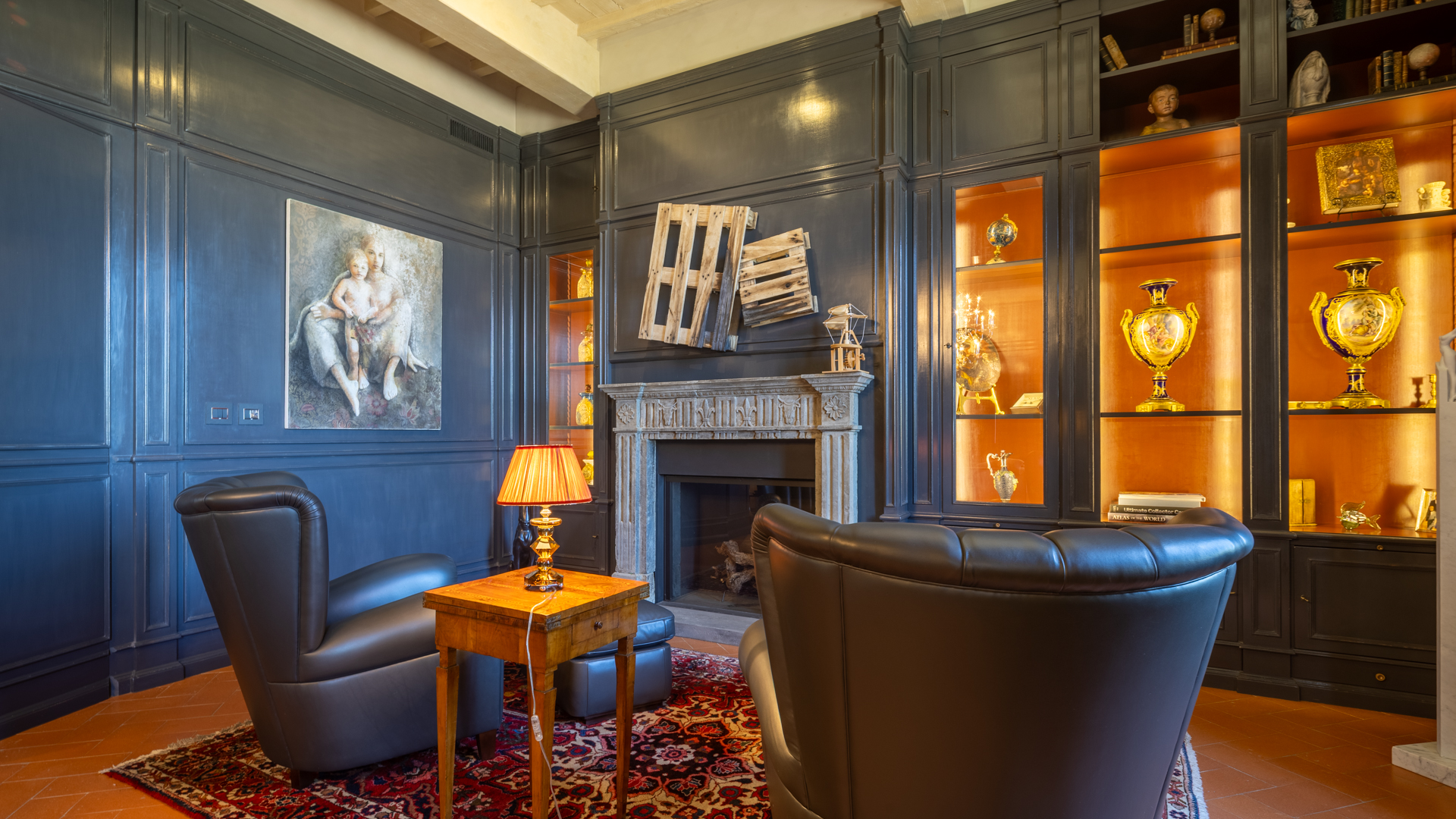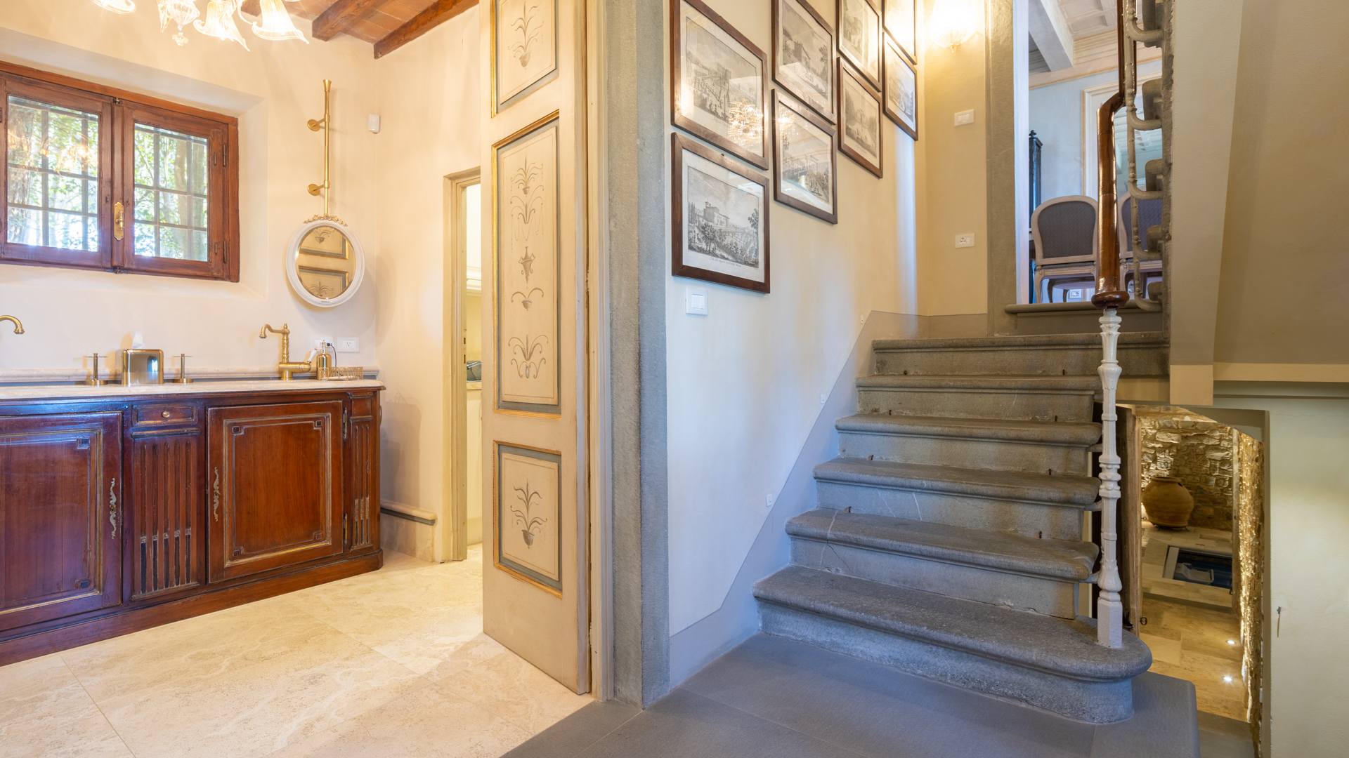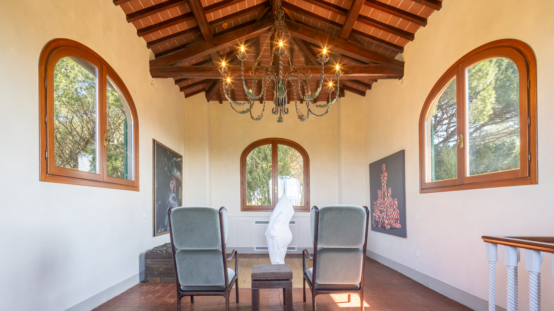 Al piano superiore, la suite padronale con grande bagno è affiancata da altre quattro camere e un salottino con accesso a una veranda panoramica affacciata sul parco privato. All’ultimo piano, la storica torre ospita oggi un luminoso salotto d’arte con vista a 360° sulle verdi colline fiorentine.