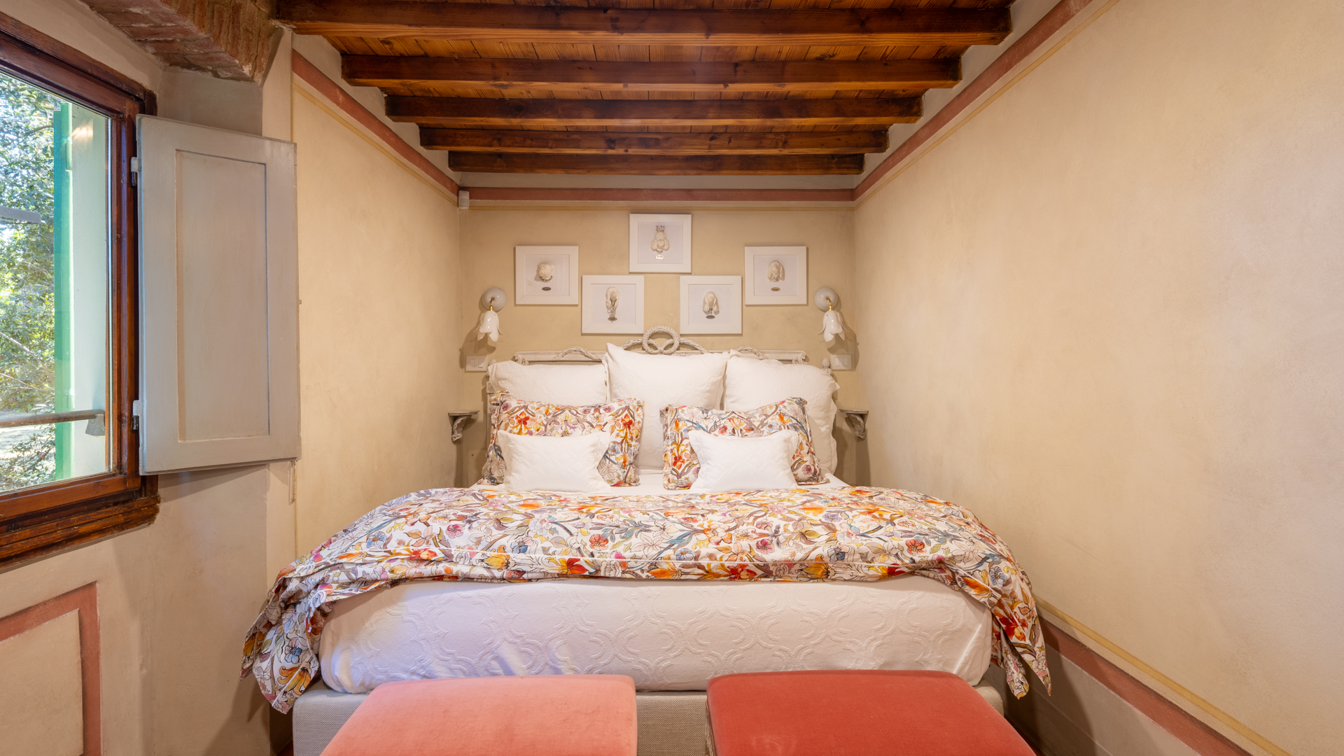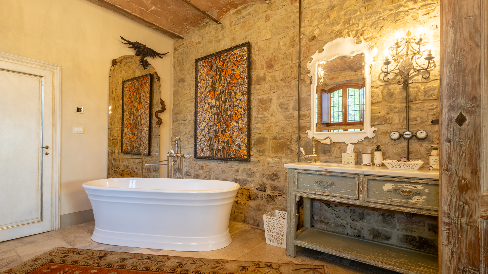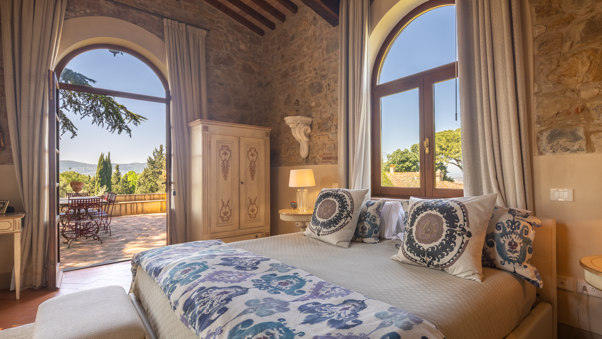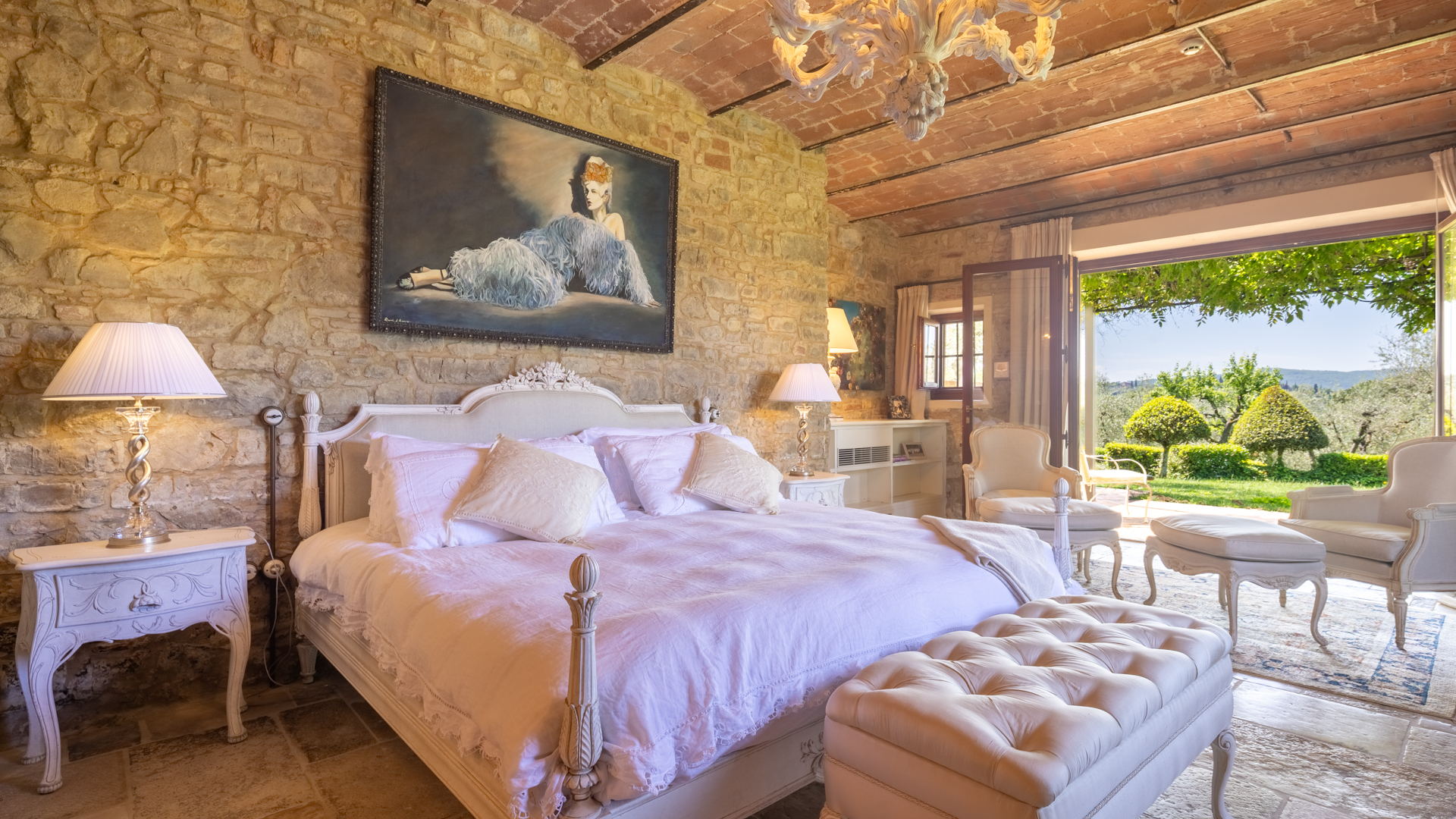 Al piano superiore, la suite padronale con grande bagno è affiancata da altre quattro camere e un salottino con accesso a una veranda panoramica affacciata sul parco privato. All’ultimo piano, la storica torre ospita oggi un luminoso salotto d’arte con vista a 360° sulle verdi colline fiorentine.