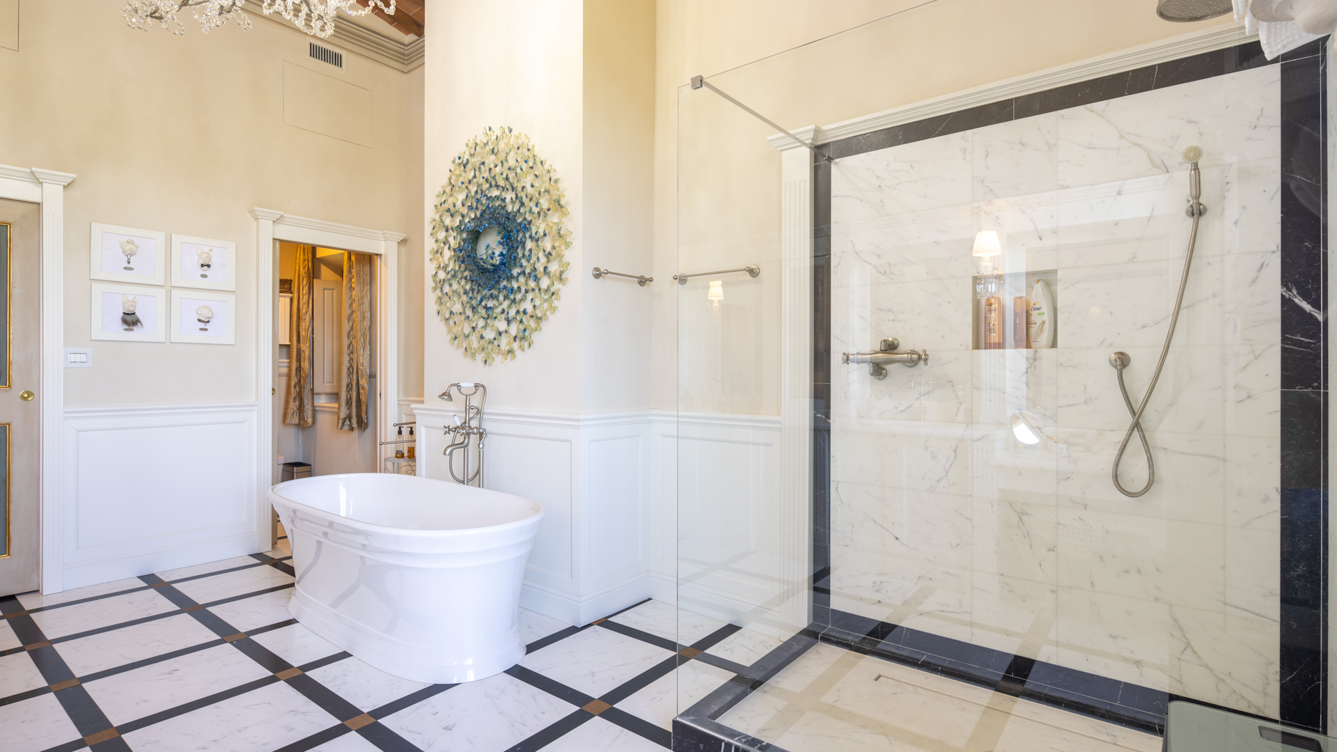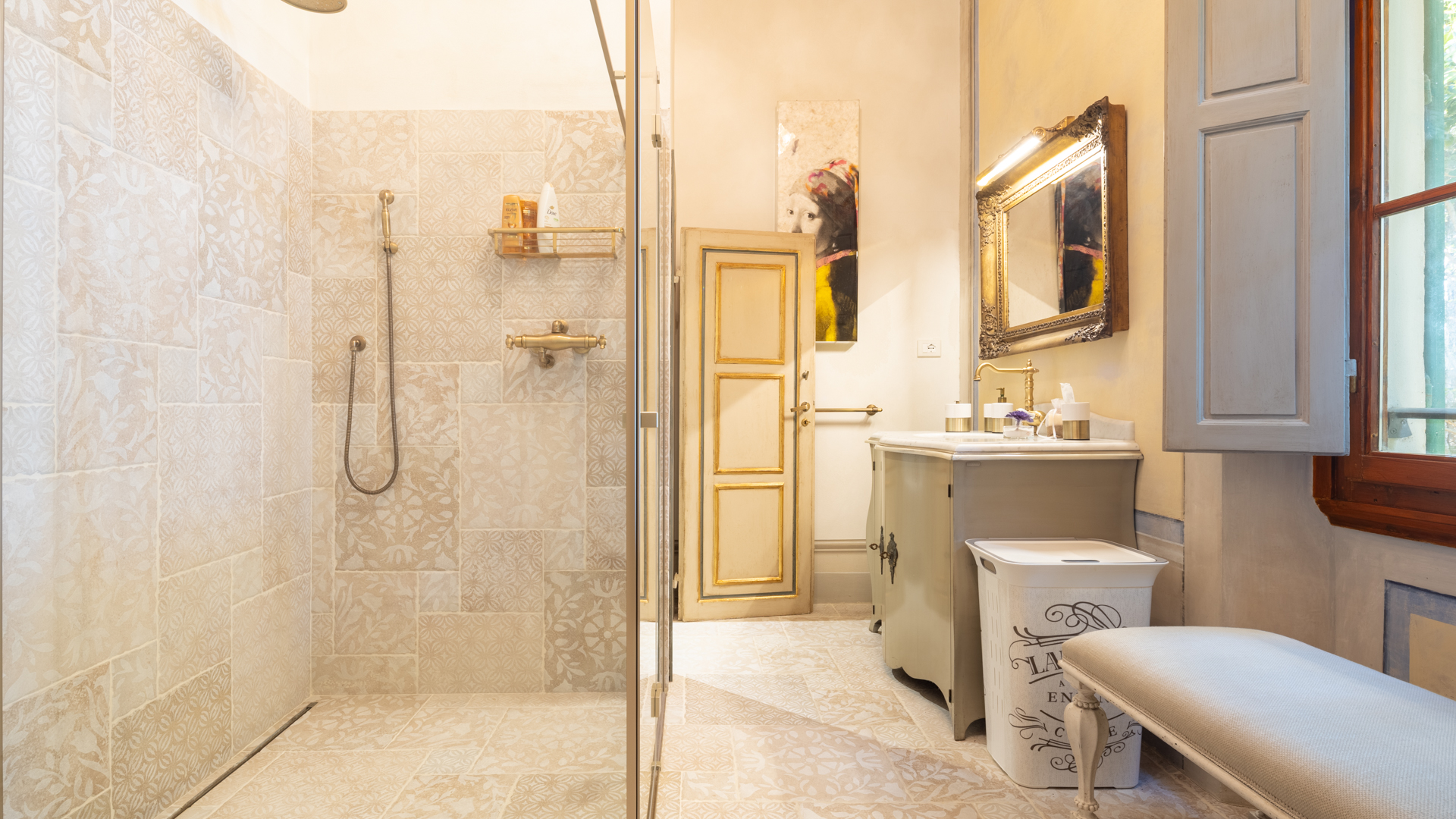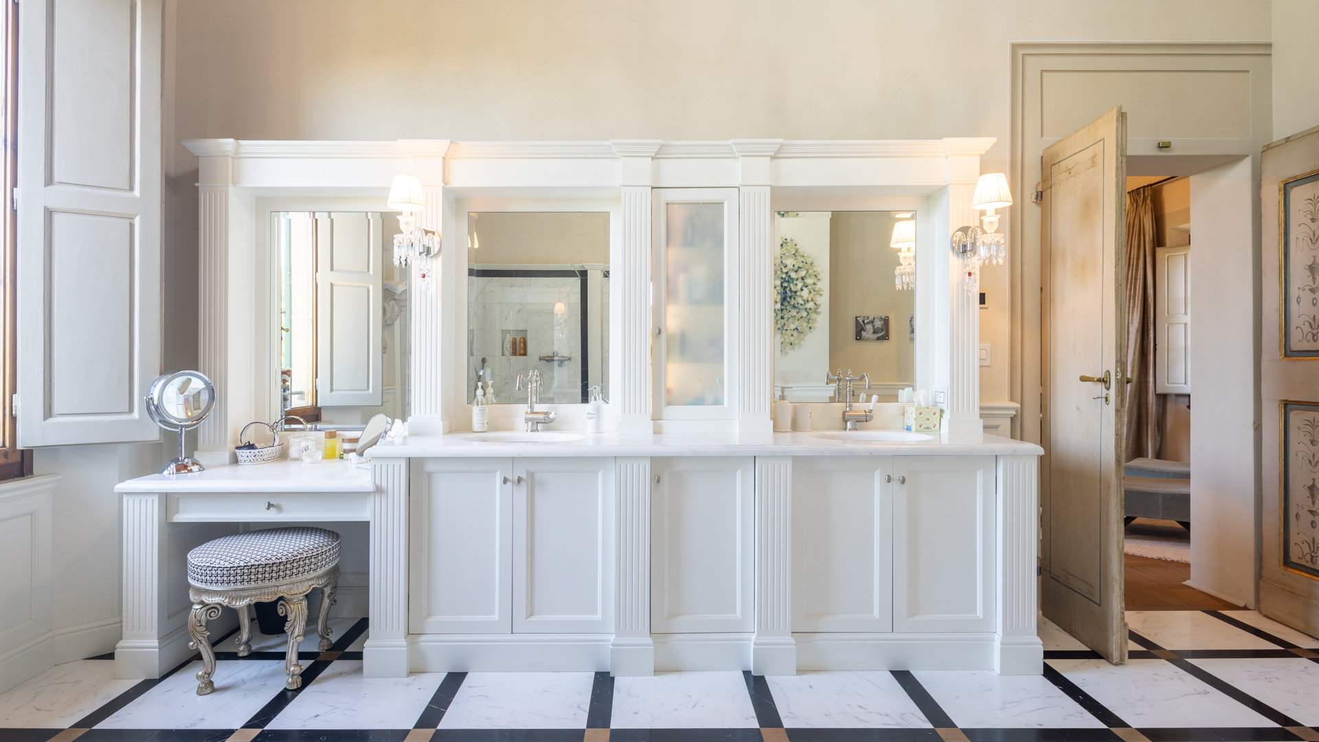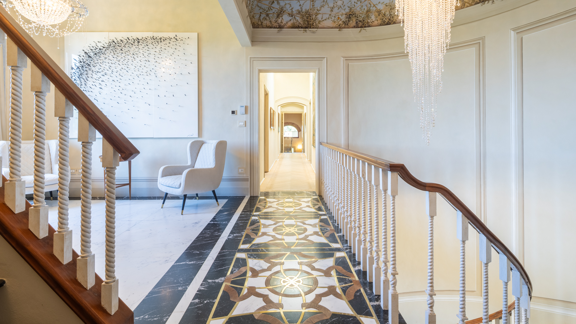 Al piano superiore, la suite padronale con grande bagno è affiancata da altre quattro camere e un salottino con accesso a una veranda panoramica affacciata sul parco privato. All’ultimo piano, la storica torre ospita oggi un luminoso salotto d’arte con vista a 360° sulle verdi colline fiorentine.
