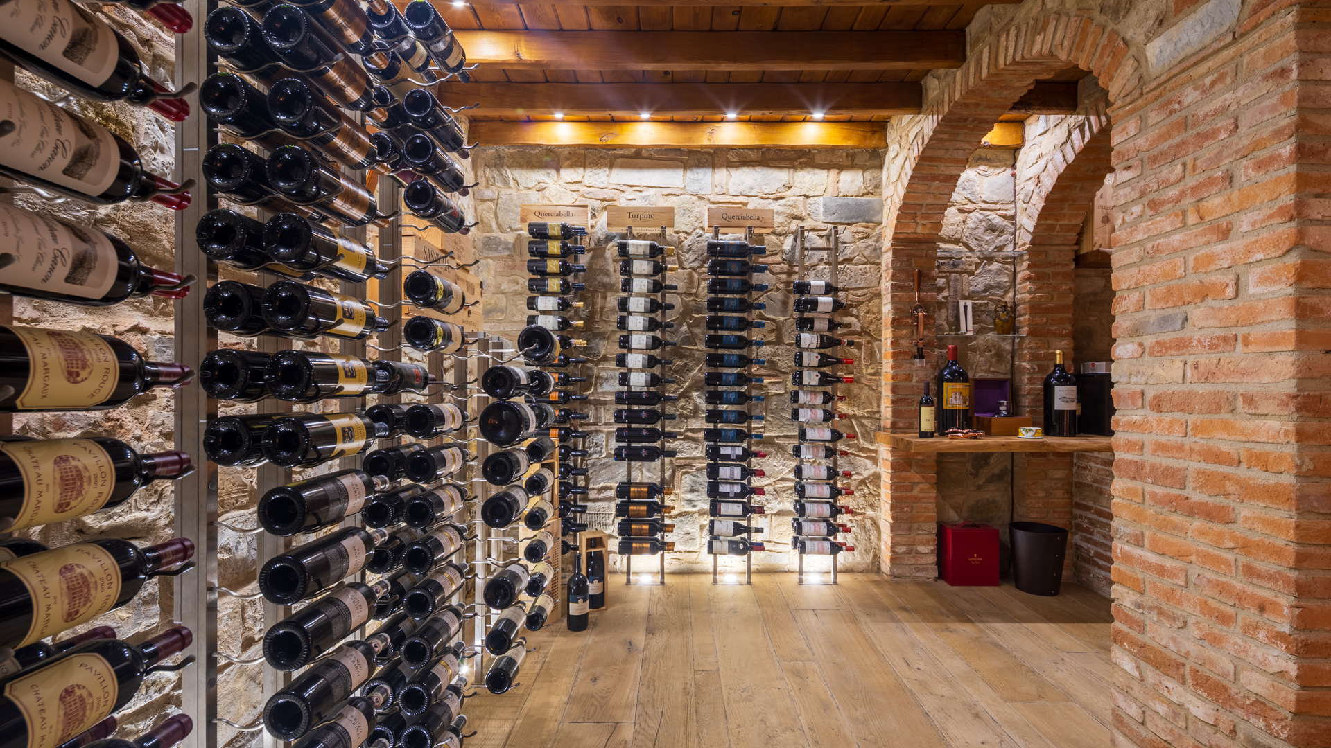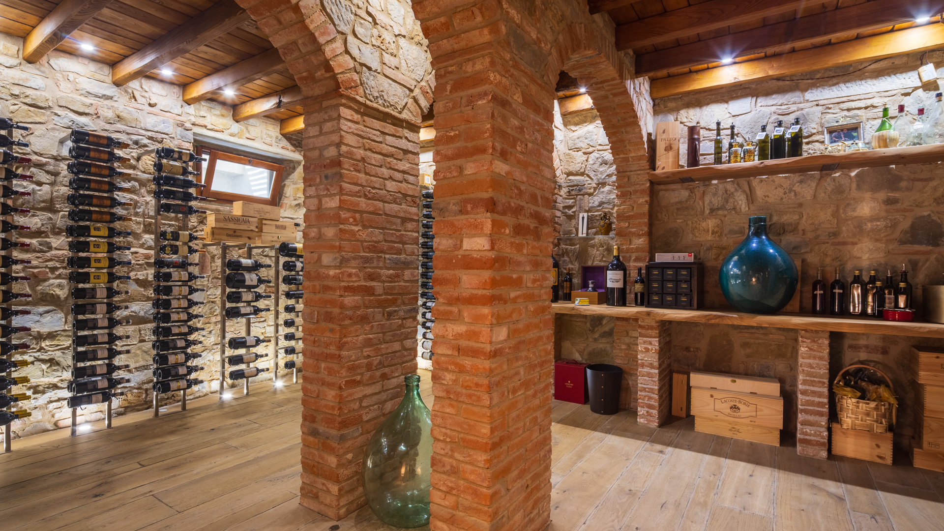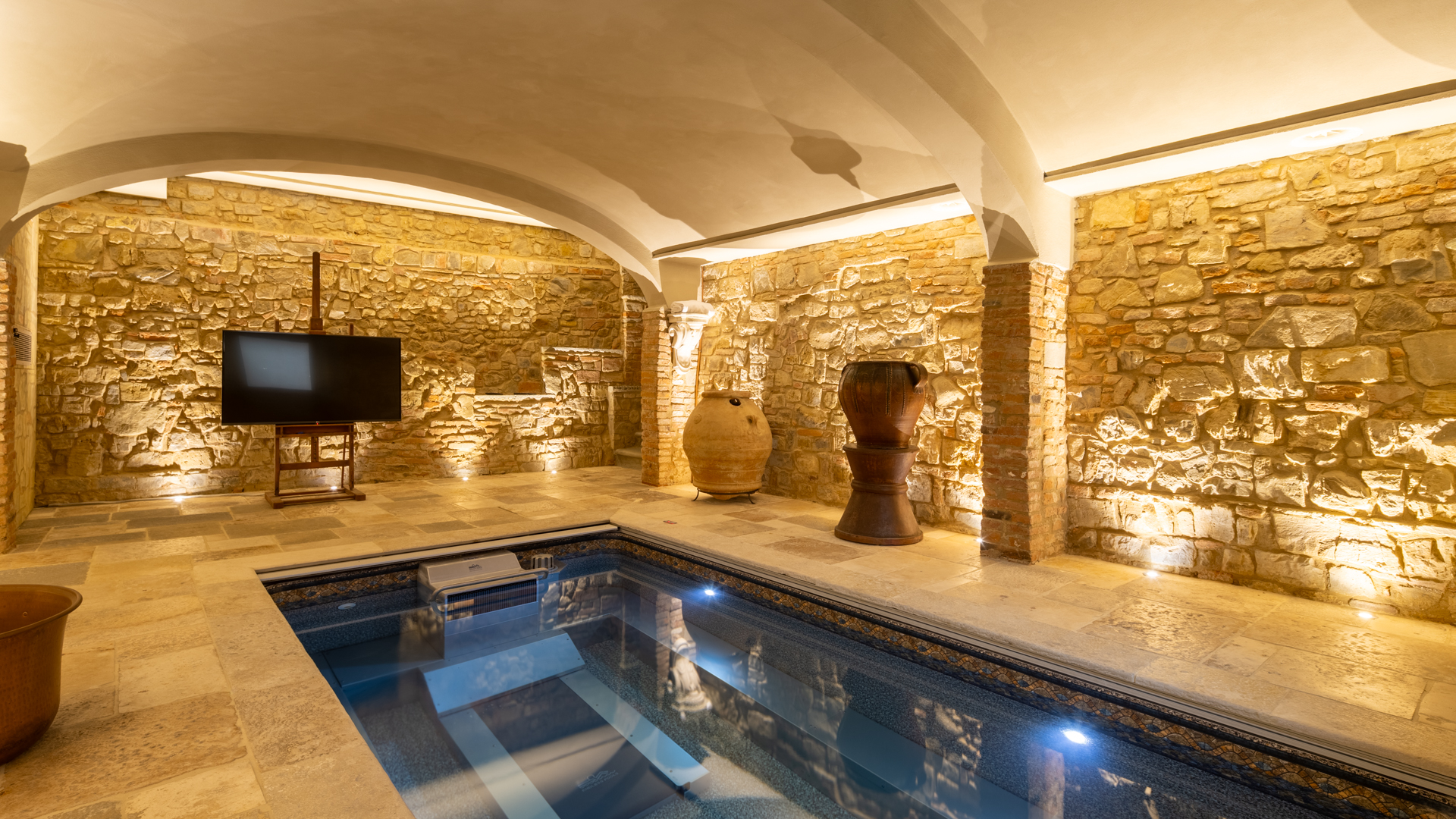 Alla destra dell’ingresso principale, si sviluppano un doppio salone e una sala cinema con camino, che conducono a un piano inferiore dedicato al benessere: piscina interna riscaldata con sistema di nuoto controcorrente, tapis roulant subacqueo integrato, cantina climatizzata con lounge per degustazioni, bagno ospiti e una seconda cucina a servizio dell’area esterna, perfetta per ricevimenti e cene all’aperto.