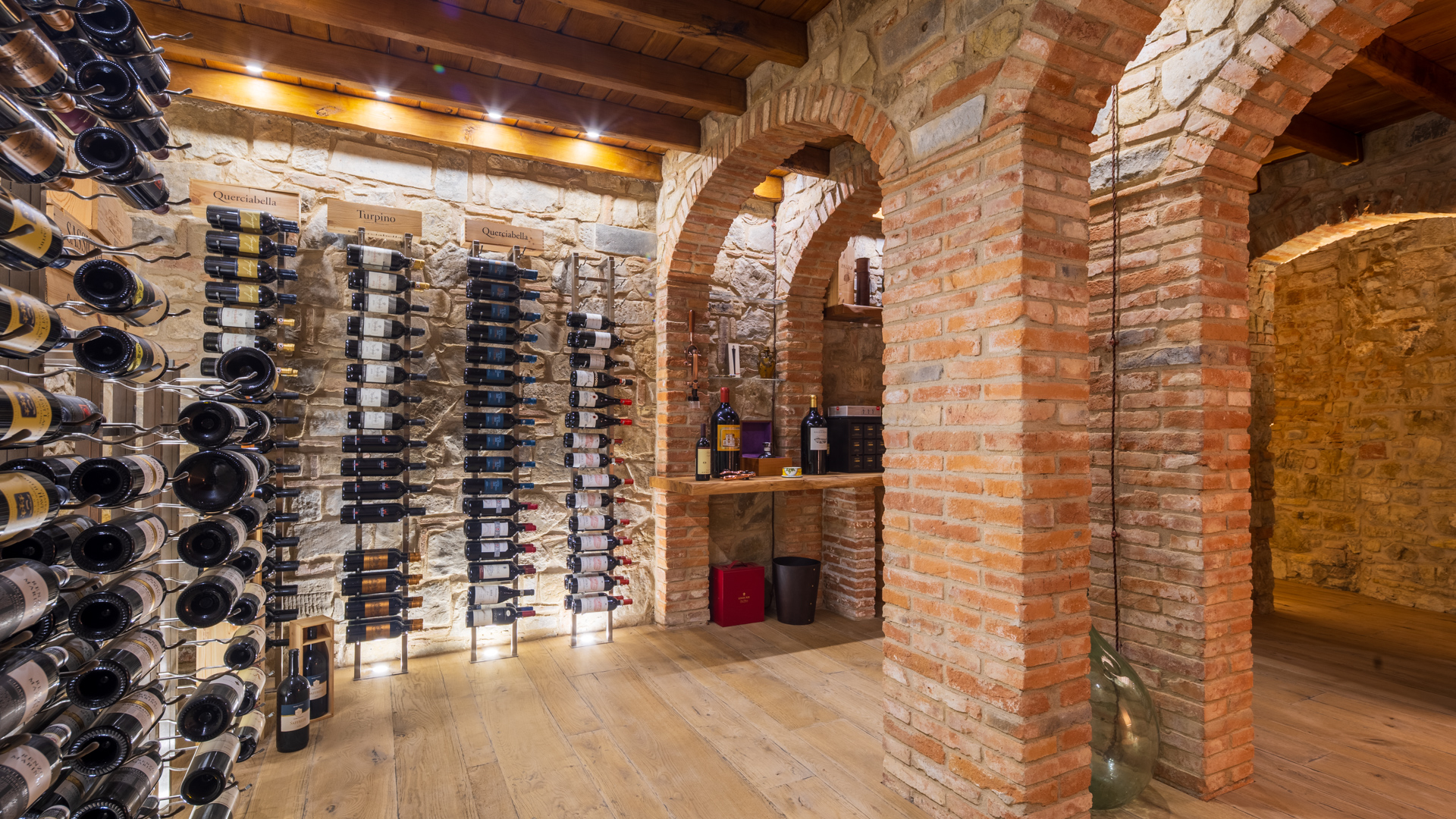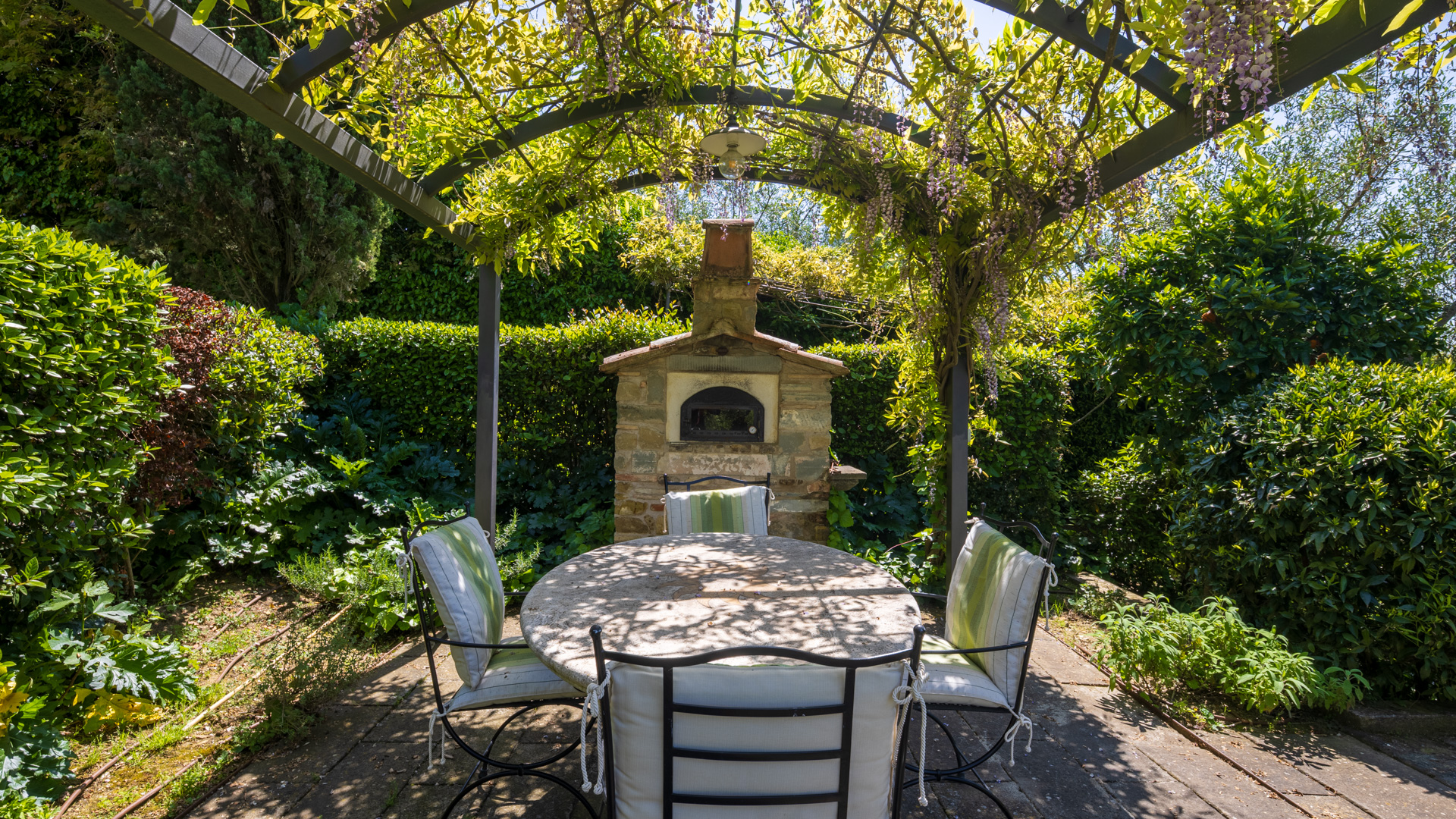 All’esterno, cortile per ricevimenti con barbecue, loggia coperta con forno a legna, e filari di vite per Vinsanto che rendono omaggio alla tradizione contadina toscana e offrono la possibilità di produrre la propria riserva privata.